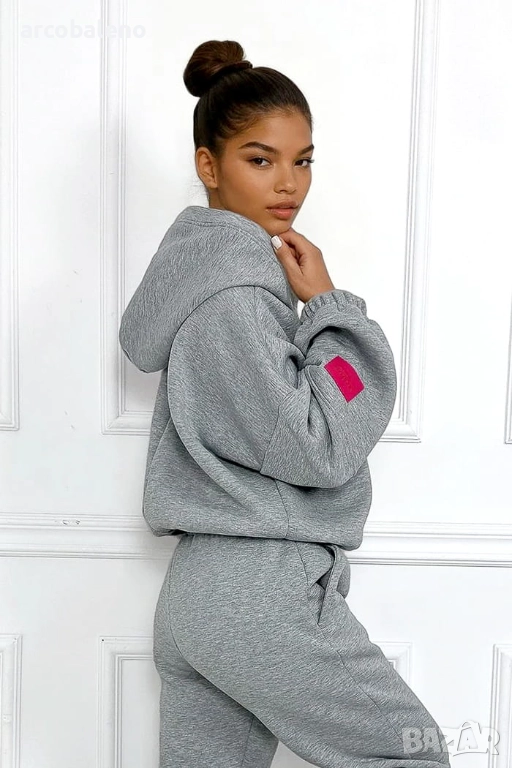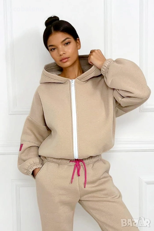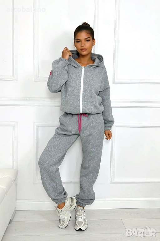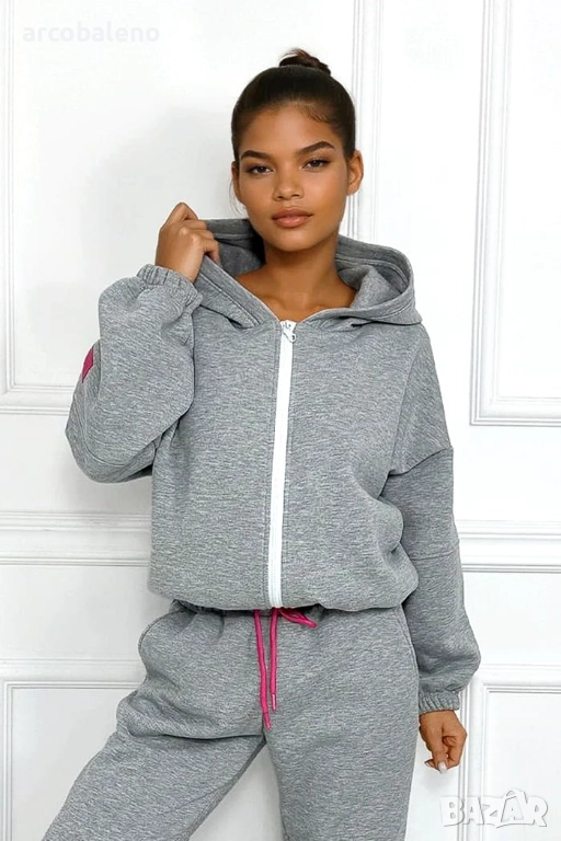 Този комплект е перфектната комбинация от комфорт и стил. Топъл, мек отвътре и удобен за носене, той е едновременно практичен и модерен благодарение на суитшърта с цип и фините акценти в ярък цвят фуксия. Можете да го носите като цяло или да комбинирате отделни части с други, за да създадете разнообразни удобни, градски визии.