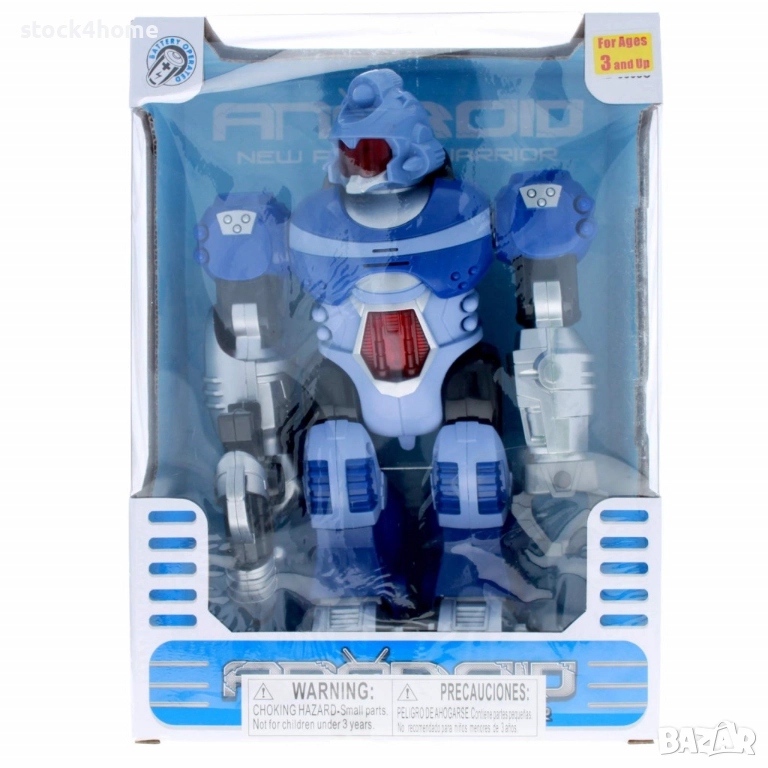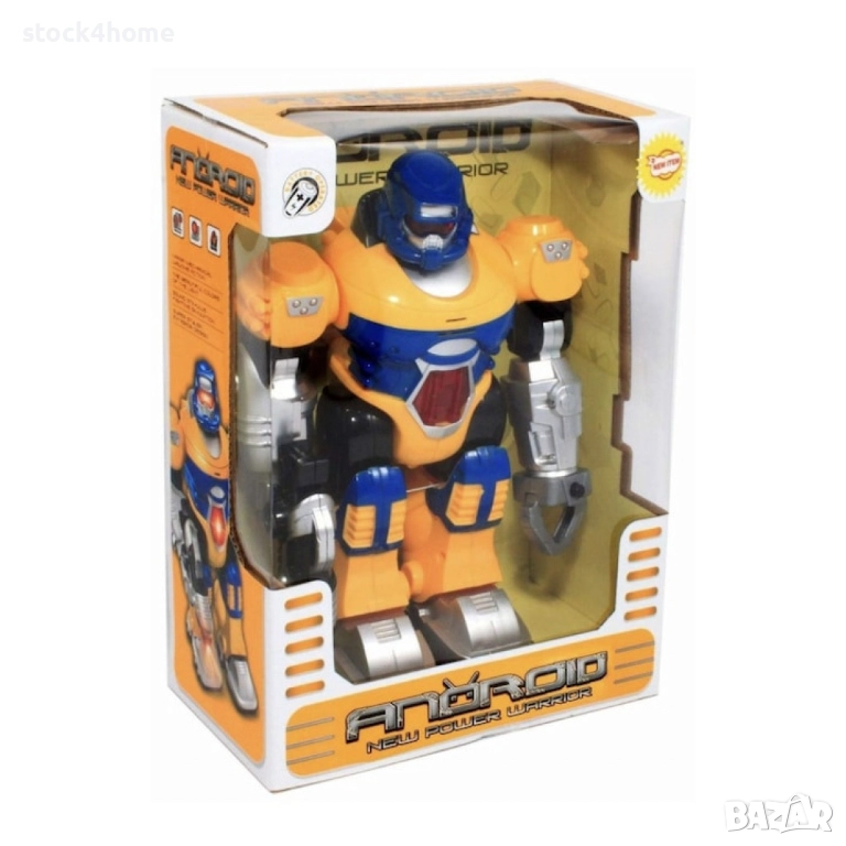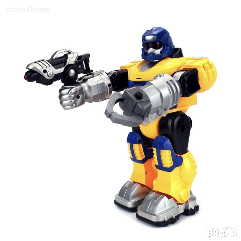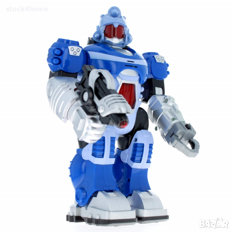 Играчката впечатлява с модерния си роботски дизайн в ярки цветове – син и жълт. Детайлната изработка включва светещи очи и гръден панел, както и оръжие в ръка, което усилва усещането за готовност за действие. Дизайнът съчетава футуристичен стил с функционалност и здравина, идеален за деца над 5 години.