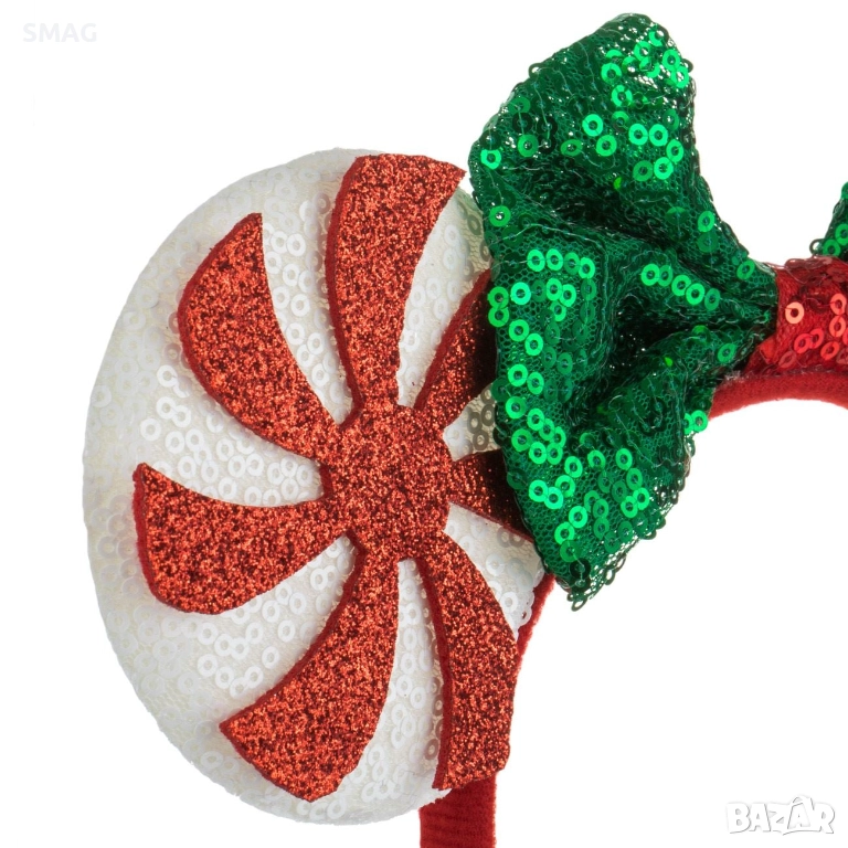 Празнична коледна диадема в ярко червено, декорирана с candy ушички, покрити с бели пайети, и ефектна червена панделка, обсипана със зелени и червени пайети. Идеален аксесоар за създаване на игриво, забавно и празнично излъчване. Подходяща за коледни партита, тържества, фотосесии и весели семейни събирания.