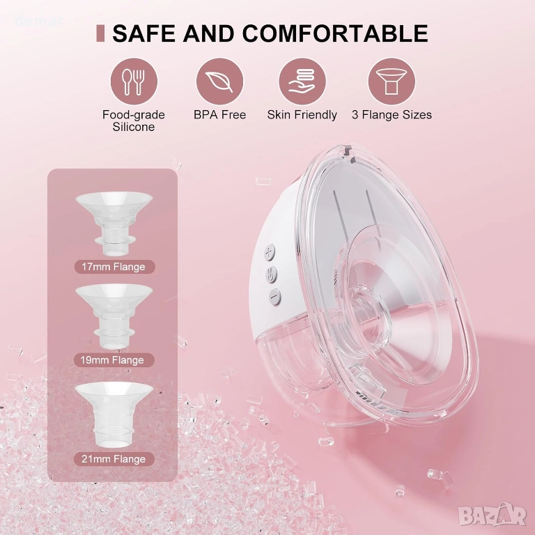 Тази носима помпа за кърма използва нежна бионична всмукателна технология и технология за микровибрация, за да имитира естественото кърмене, предлагайки четири режима, девет нива на интензивност и функция за памет за персонализиран комфорт. Нейният контуриран, дискретен дизайн се вписва невидимо в сутиена, а затворената структура защитава чистотата на кърмата и предотвратява обратния поток. Изработена от хранителни материали без BPA, тя е лесна за почистване и включва множество размери фланци за точно прилягане. Дълготрайната батерия поддържа до шест сесии с едно зареждане, а LED дисплеят осигурява ясен контрол върху настройките и подробностите за сесията.