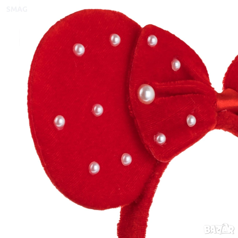 Елегантна коледна кадифена диадема с меки червени ушички, украсени с бяла панделка и нежни перли. Акцент, който комбинира празничен чар и стил, идеален за тържества, училищни събития, коледни партита и тематични фотосесии.