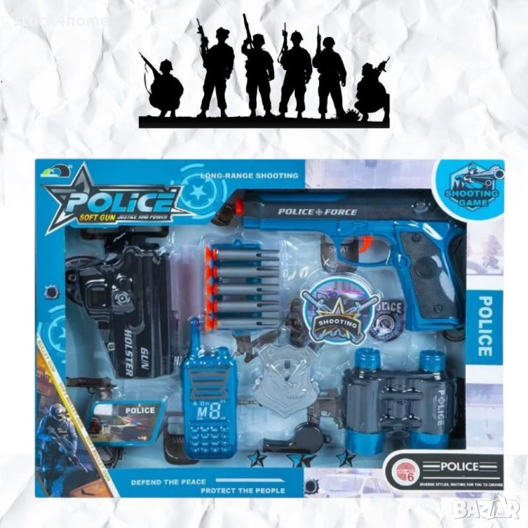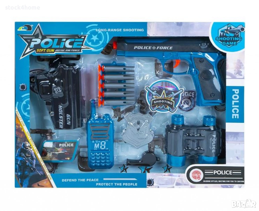 Дизайнът на полицейския комплект е в класически стил, като се съчетават удобство и естетика, които ще харесат на всяко дете. Пистолетът и другите аксесоари имат автентичен вид, който наподобява истинските полицейски инструменти, но са изработени от безопасни и издръжливи материали. Комплектът е с ярки цветове, които привлекат вниманието и правят играта още по-интересна. В допълнение, всяка част от комплекта е лека и удобна за употреба от малките ръце.