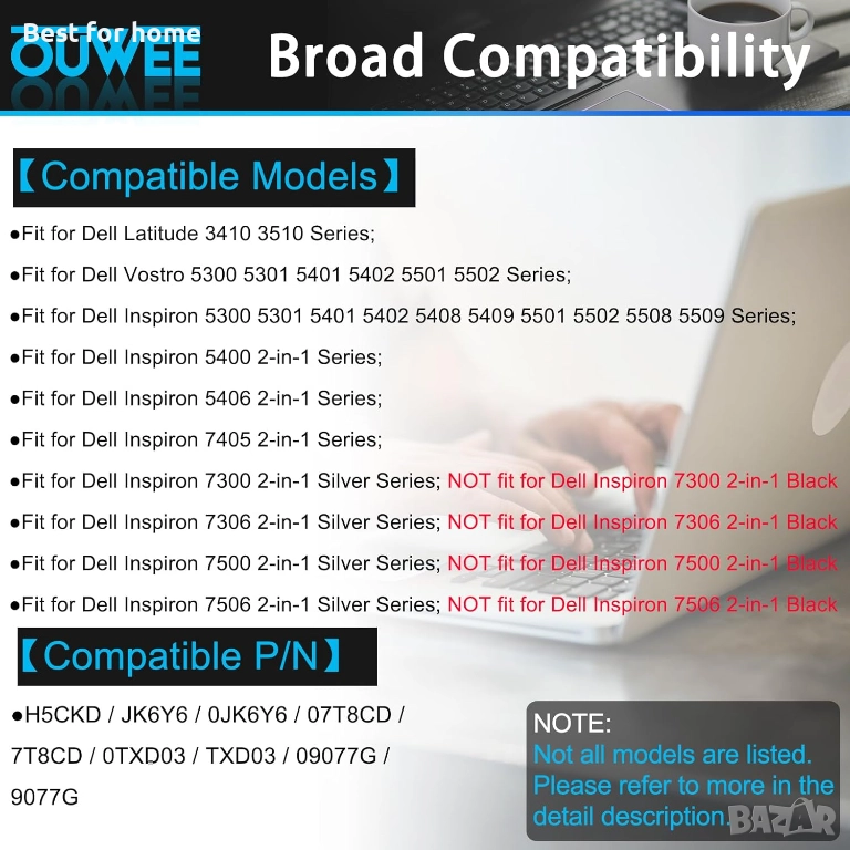 【Спецификации】Тип батерия: Литиево-йонна. Напрежение: 15V; Капацитет: 53Wh. Време на цикъла: ≥500 цикъла; Време на работа: ≥60 минути на зареждане. Състояние: Чисто нова, изработена от висококачествени материали, с висококачествени платки и интелигентен чип. 【Напълно съвместима и с висока стабилност】Подходяща за Dell Latitude 3410 3510 серия, батерия за Dell Vostro 5300 5301 5401 5402 5501 5502 серия, Inspiron 5300 5301 5401 5402 5408 5409 5501 5502 5508 5509 серия, батерия за Dell Inspiron 5400 5406 7405 7300 7306 7500 7506 2-в-1 сребриста батерия за лаптоп (НЕ е подходяща за 7300 7306 7500 7506 2-в-1 черна серия. Моля, проверете също номера на частта и формата на оригиналната батерия, за да избегнете грешна покупка!)