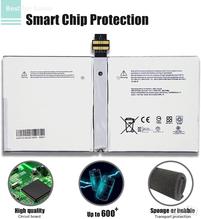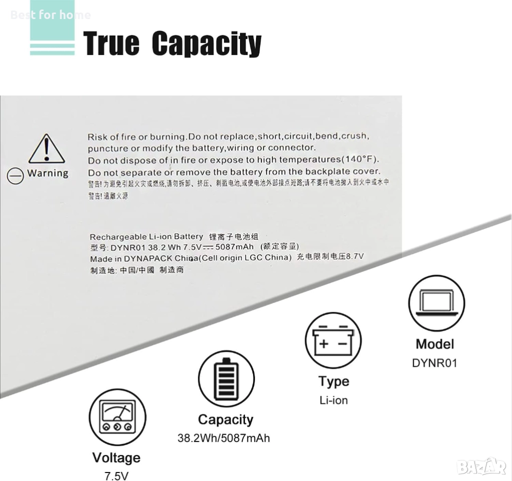 Модел на батерията: DYNR01** Напрежение: 7.5 V ** Капацитет: 38.2 Wh ** Тип: Литиево-йонна батерия