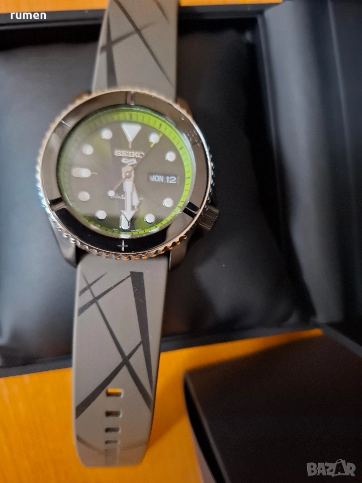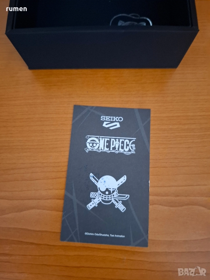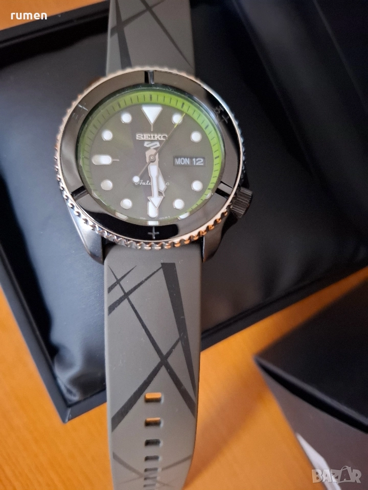 Невероятен лимитиран модел на Seiko, който е в сътрудничеството с популярния японски комикс сериал ONE PIECE, вдъхновен от Зоро, потребителят на трите меча, на когото Луфи има огромно доверие. Моделът има корпус от неръждаема стомана с черно покритие и маслено зелена силиконова каишка. Разполага със зелен циферблат украсен в образа на меч, разсичащ с оръжие Хаки. Дисплеят е с аналогови показатели и датник с ден от седмицата на 3 часа. Върху задния капак на корпуса има изобразени графики, вдъхновени от меча Wado Ichimonji, който Зоро наследи от своя близък приятел, Куина, с клетвата на Зоро, "Аз ще бъда най-великият фехтовач в света!". Има фосфоресцентно покритие за по-добро разчитане в тъмното и специално стъкло Hardlex – синтетичен минерал-кристал, който се използва само от Seiko и е изключително здрав и устойчив на надраскване. Моделът се задвижва от автоматичен механизъм Caliber 4R36 с ръчно навиване и 24 камъка с 41 часа резервна мощност. Диаметър на корпус 42.5 мм, дебелина 13 мм. Водоустойчивост: 10 АТМ.