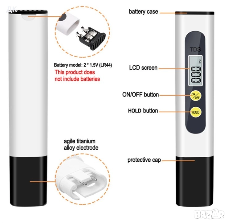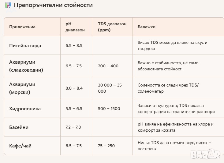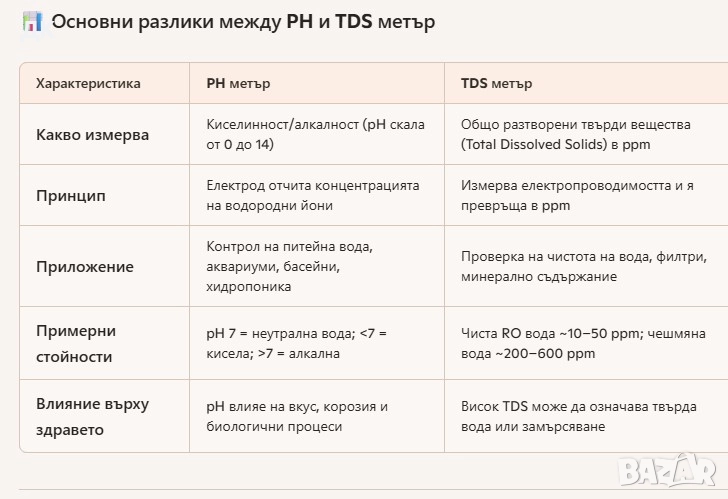TDS метър: Често използван за проверка на филтри за вода, системи за обратна осмоза и аквариуми. Колкото по-нисък е TDS, толкова по-чиста е водата.