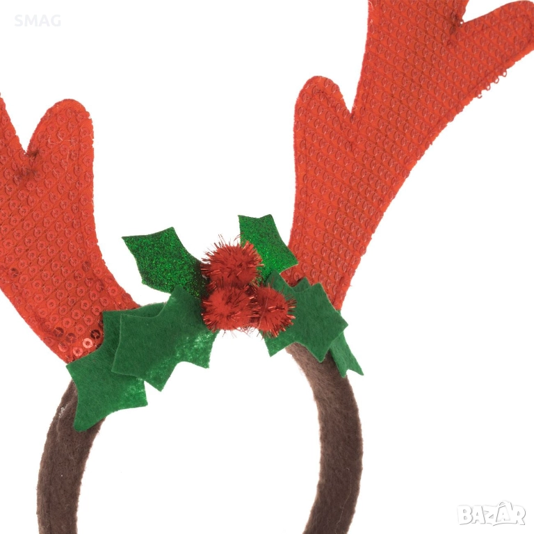 Празнична коледна диадема с декоративни рога, украсени с червени и златисти плодчета. Идеален аксесоар за коледни партита, училищни тържества, семейни събирания и фотосесии. Лека и удобна за носене, създава забавен и празничен акцент към всяка визия.
