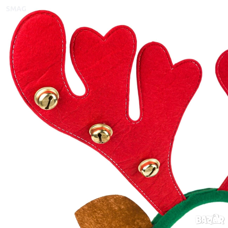 Празнична коледна диадема с червени кадифени еленови рога, ушички и златисти звънчета. Идеален аксесоар за коледни партита, училищни тържества и фотосесии, който добавя забавен и празничен акцент към всяка визия. Лека и удобна за носене.