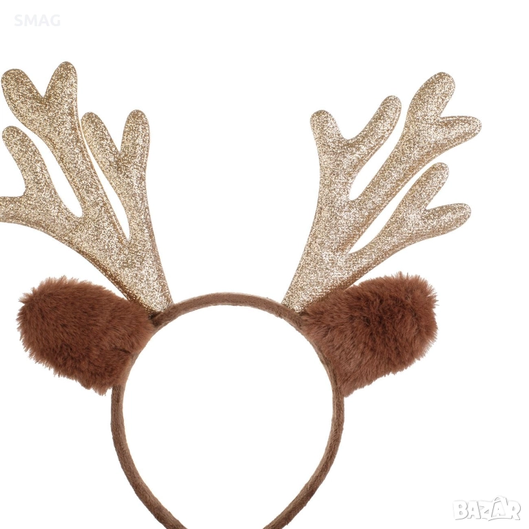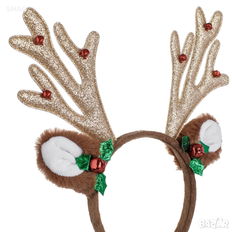 Празнична коледна диадема с кафяви еленови рога, украсени със шампанско брокат, червени звънчета и имел. Диадемата разполага със синтетична кафява козина на ушичките, помпон и бели пухчета за завършен празничен вид. Идеален аксесоар за коледни партита, училищни тържества и фотосесии, който създава забавен и ефектен празничен акцент.
