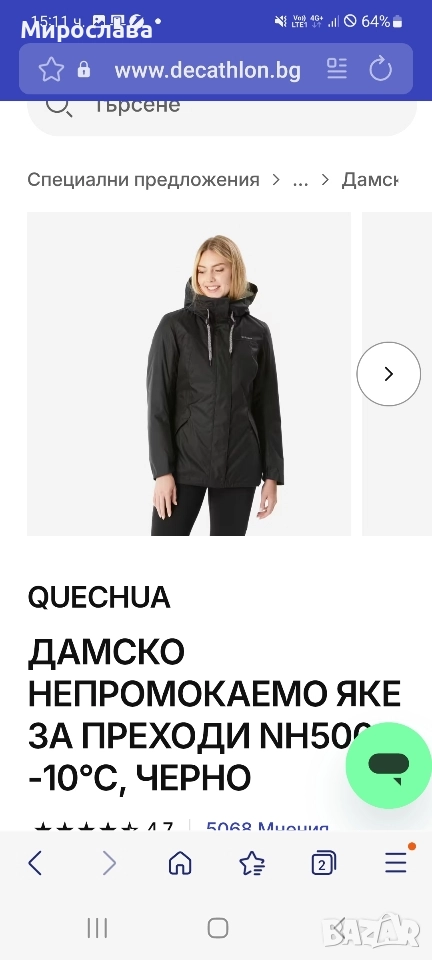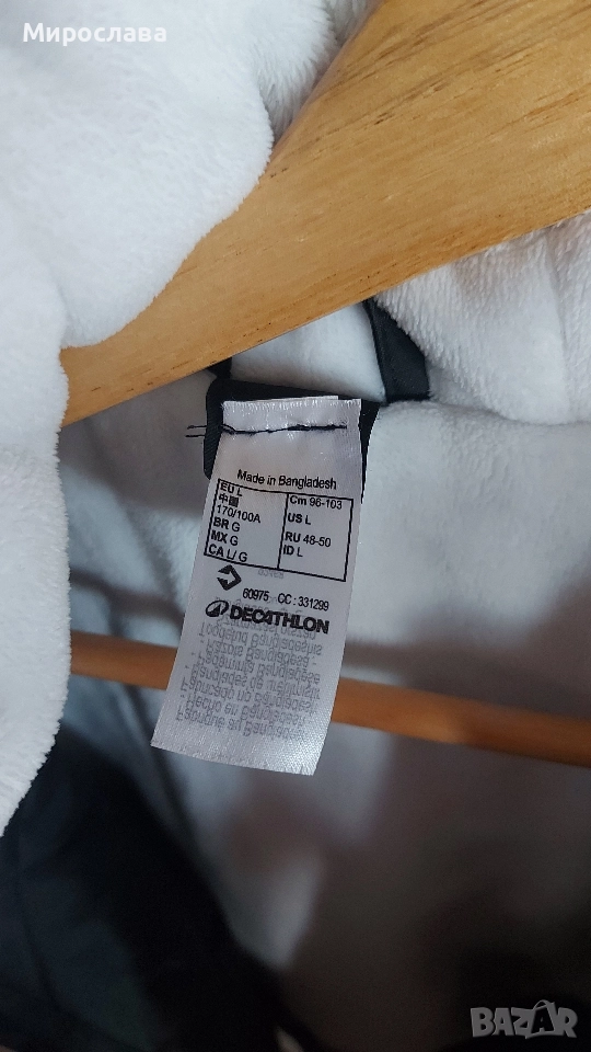 Якето е закупено от Декатлон за 85 лв. В момента е намалено на 75 лв. Моята цена е 55 лв. Има забележка на единия ръкав. Снимана е.