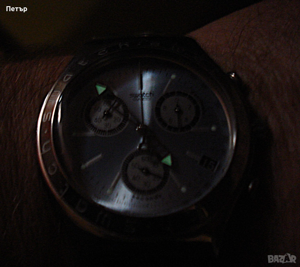 хронографа работи, календара прехвърля. Светещи стрелки.