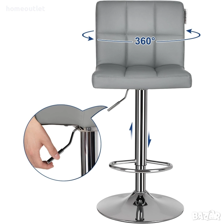 Комплект от 2 въртящи се бар стола с регулируема височина, удобна облегалка, поставка за крака и стабилна основа за максимална безопасност.