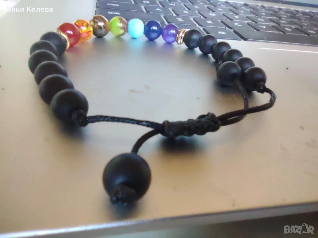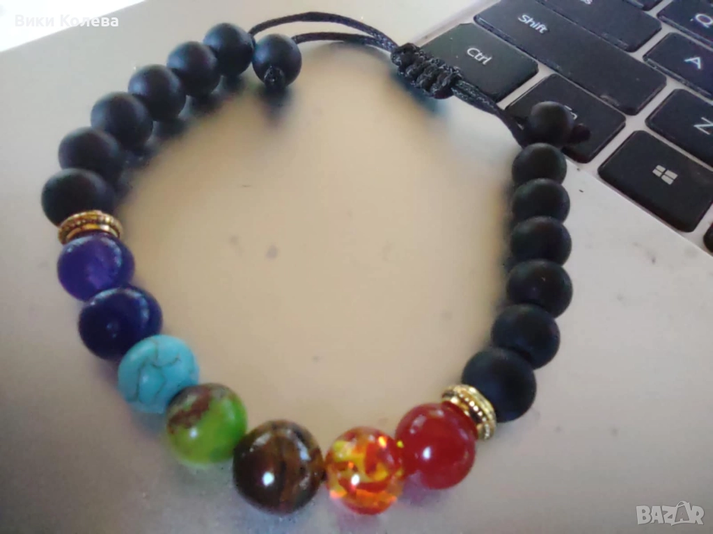 Черните матирани камъни (вероятно Черен Оникс или Лава) по цялата гривна ти осигуряват постоянна защита от негативни енергии и дълбоко заземяване, за да можеш да балансираш енергията на цветните чакри.