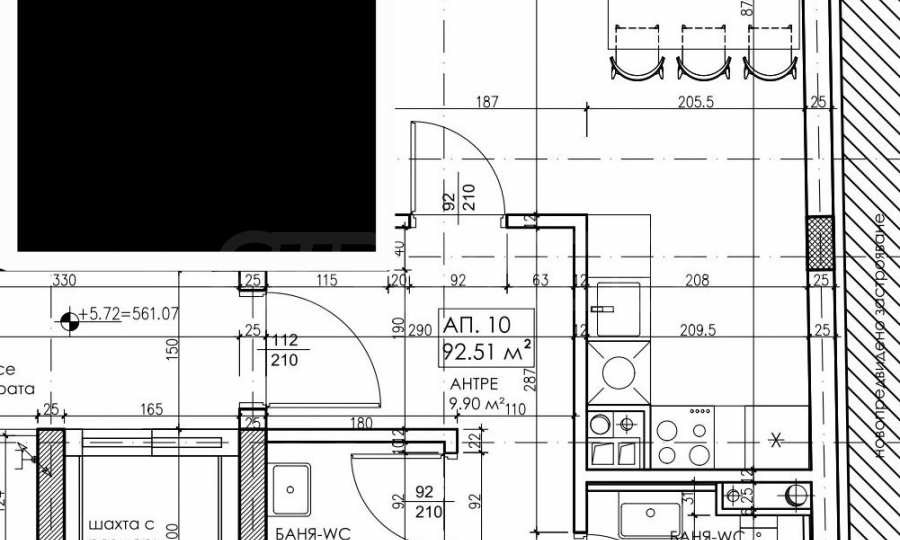 Проектирана е самостоятелна жилищна сграда на 7 етажа с надземни паркоместа и гаражи.