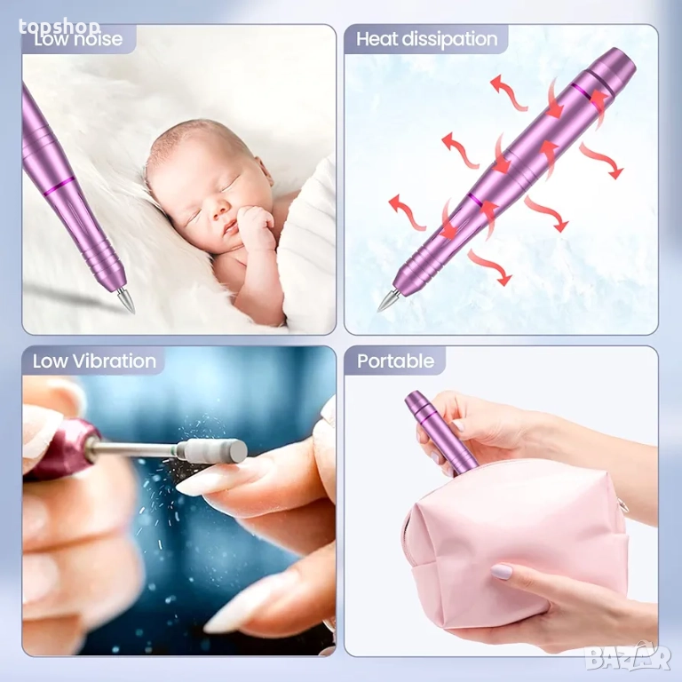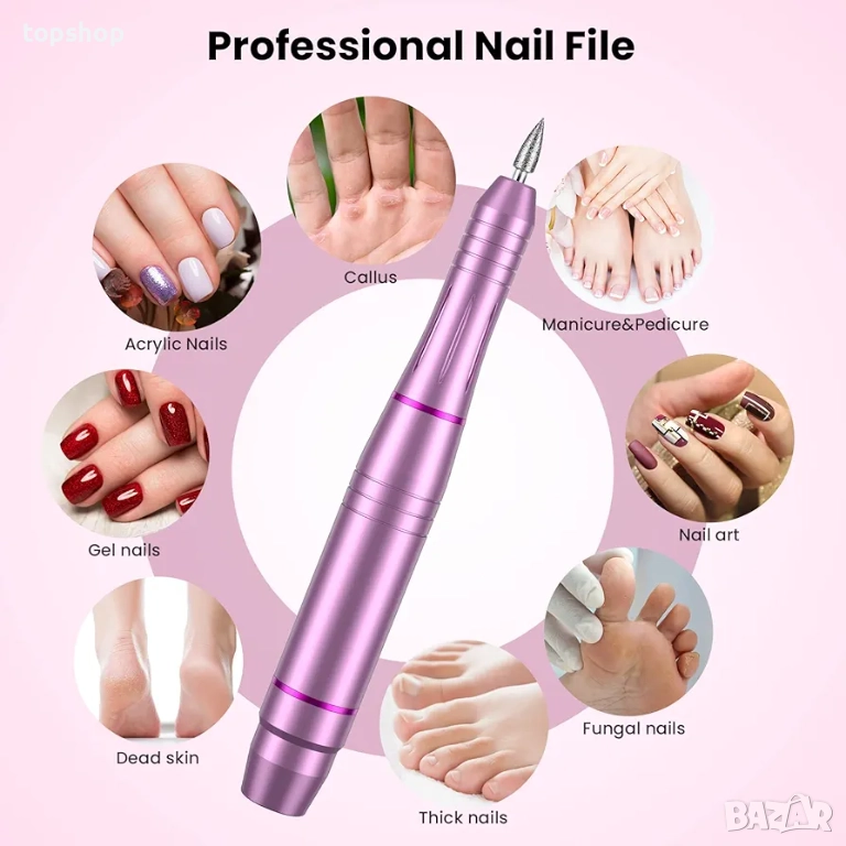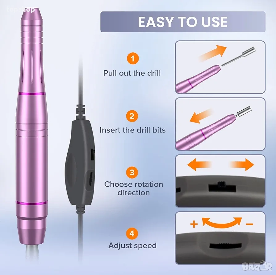 Подобрена електрическа бормашина за нокти】- Комплектът включва 11 различни накрайника за бормашина, 26 шлифовъчни ленти, 1 четка, 1 стъклена пила за нокти. 5 цвята по ваш избор! Тези електрически пили за нокти могат да се използват за маникюр, педикюр, полиране, оформяне, шлайфане на кожички, премахване на акрилни/гел нокти или за разкрасяване на ноктите. Идеални както за естествени, така и за изкуствени нокти и улесняват грижата за ноктите ви у дома!