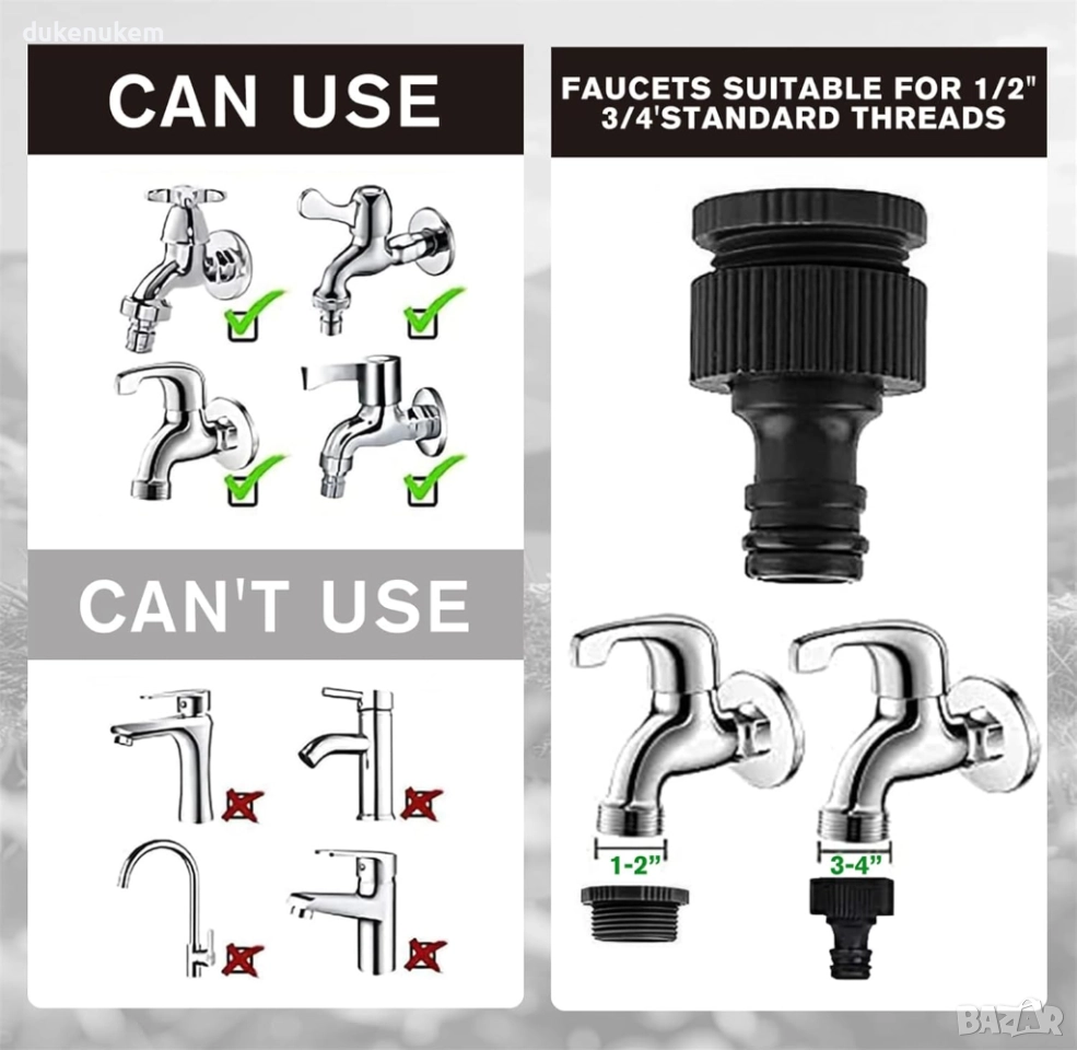 Висококачествени бързи конектори 3/4" и 1/2" – универсално съвместими с почти всички кранове и системи.