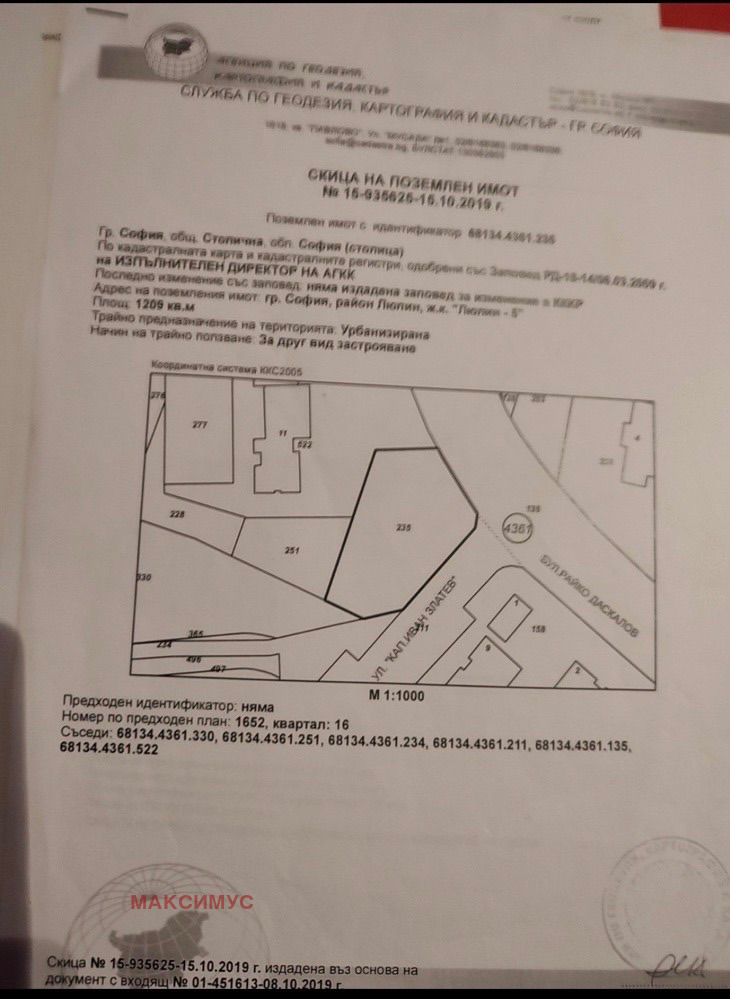 Представяме на вашето внимание равен, ъглов парцел на главен бул Райко Даскалов в столичния квартал ж.к Люлин 4 . Упито се състои от два парцела съответно 68134.4361.235 с площ от 1300 кв.м и 68134.4361.251 с площ от 464 кв.м. Постижимото РЗП е 3880кв.м
