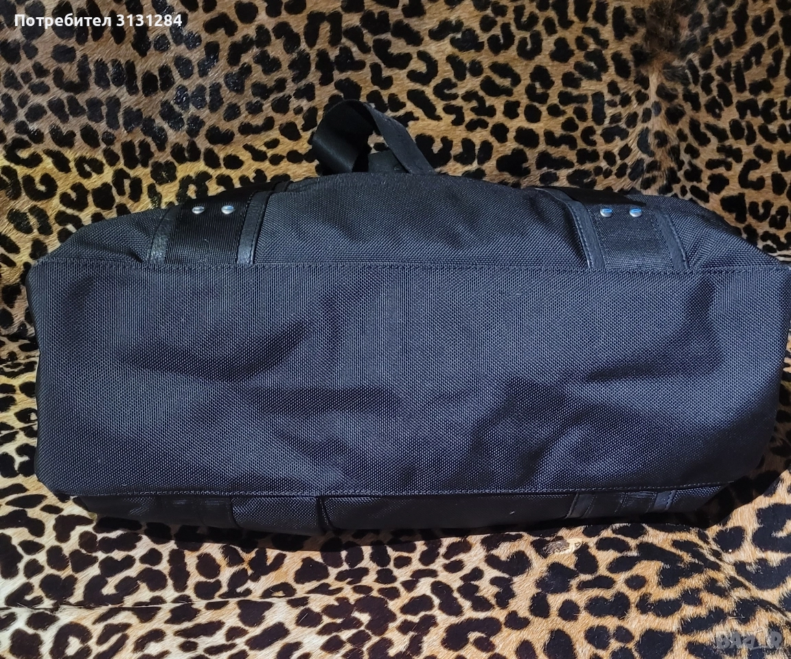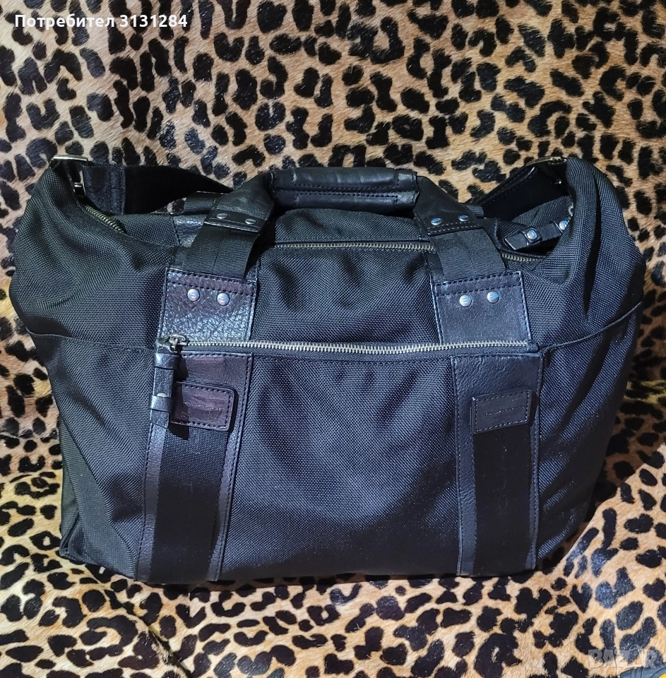 Чанта за пътуване или работа, изработена от естествена кожа и плат, в перфектно състояние. Известна италианска марка. Цената беше 360 евро.Вътре има дръжка за през рамо,дръжки за закрепване към куфара, много допълнителни аксесоари, хастарът е в перфектно състояние като нова. Размер на дъното 43×14см , Височина 30 см.