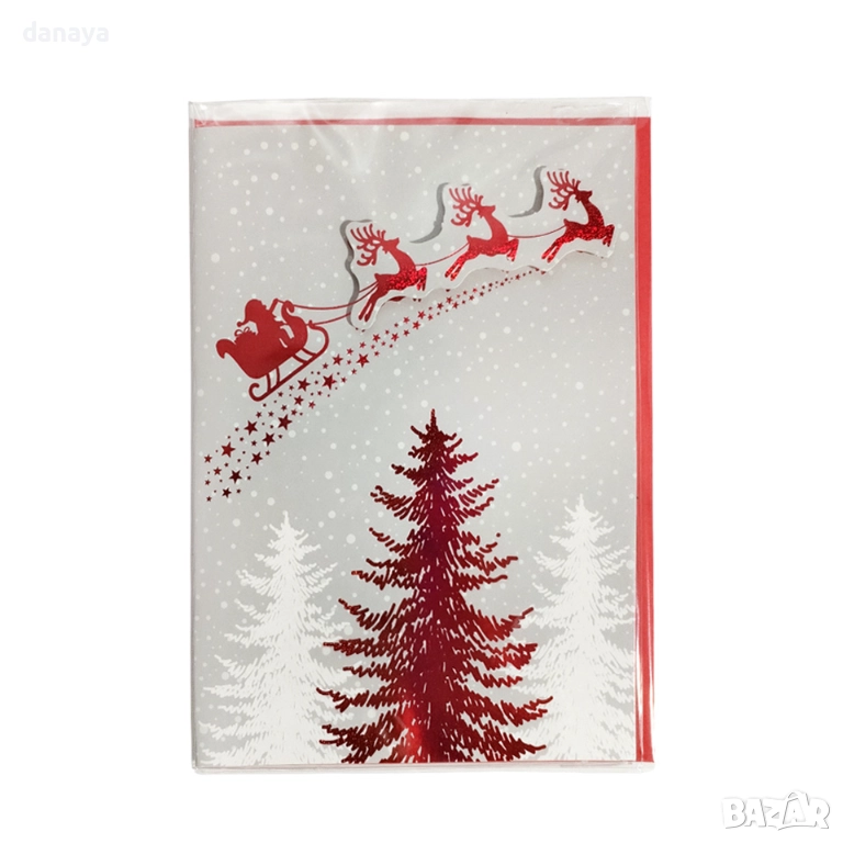 Коледната картичка с червен плик е елегантен и празничен начин да предадете топли пожелания на близки, приятели или колеги. Стилните зимни мотиви и контрастните червено-сребристи акценти я правят универсална за всякакви коледни поводи – от лични поздрави до фирмени подаръци.