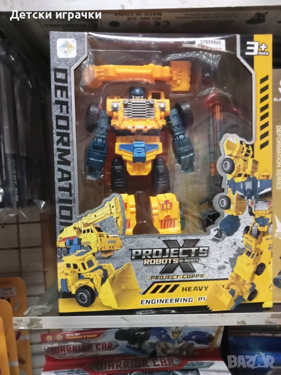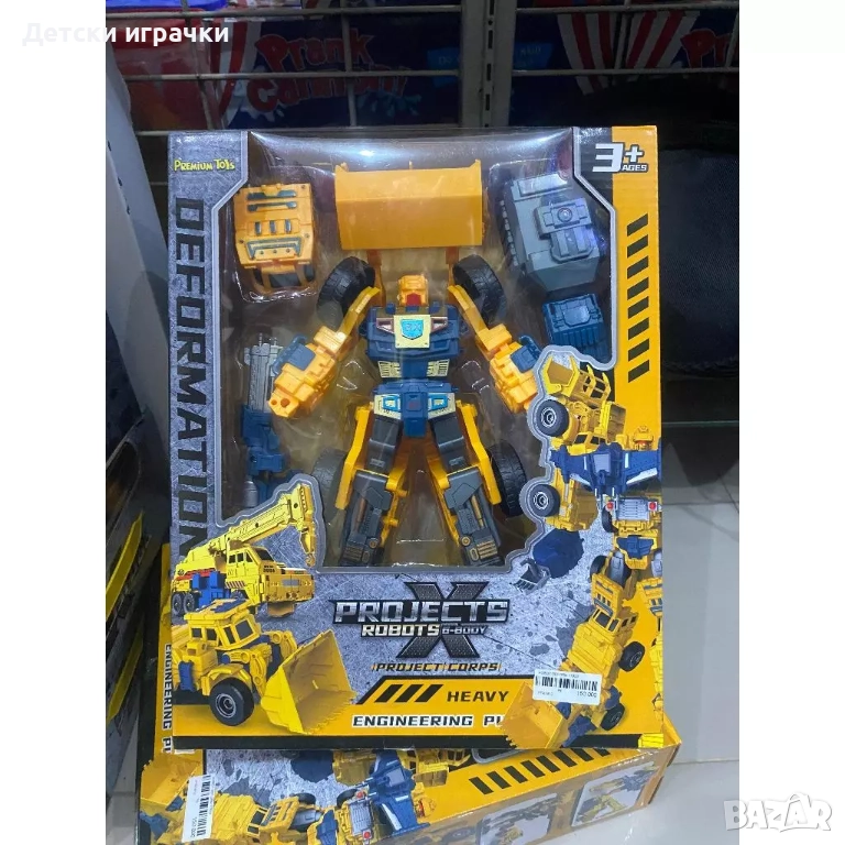 Трансформираща се играчка робот/строително превозно средство, "Project Corps". Играчката може да се превръща от робот в жълт самосвал или друго тежко инженерно превозно средство и обратно.