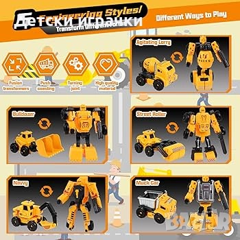 Играчката предлага два режима на игра – детайлна екшън фигура на робот и реалистичен жълт самосвал/кран.