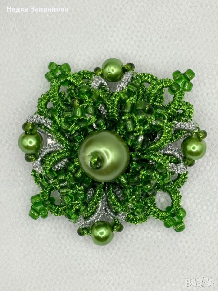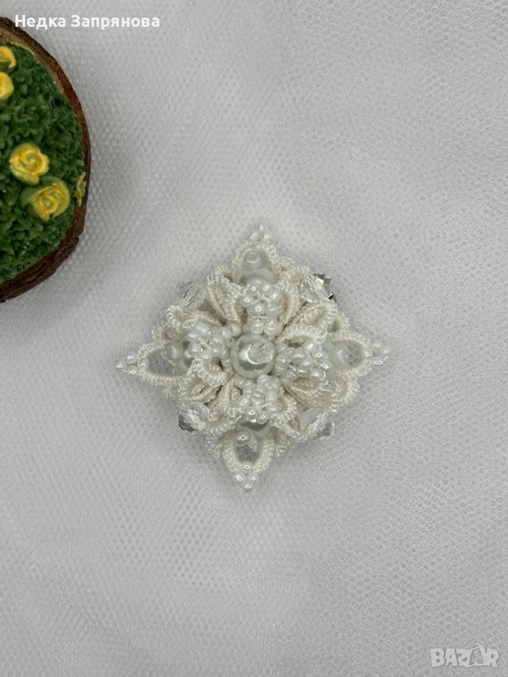 Изработена с много любов, фино изплетена и украсена с перли и стъклени мъниста, тази брошка е перфектното допълнение към всеки тоалет – от ежедневен до официален.