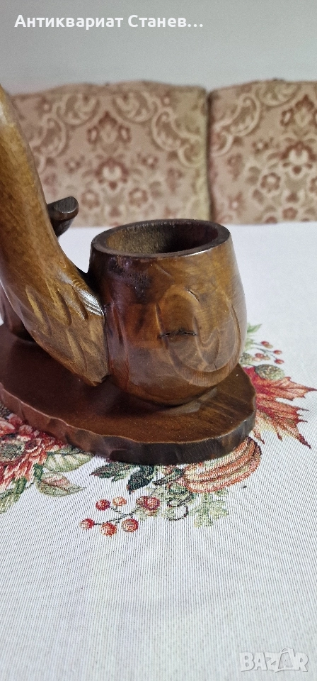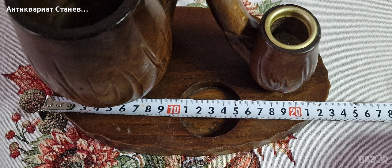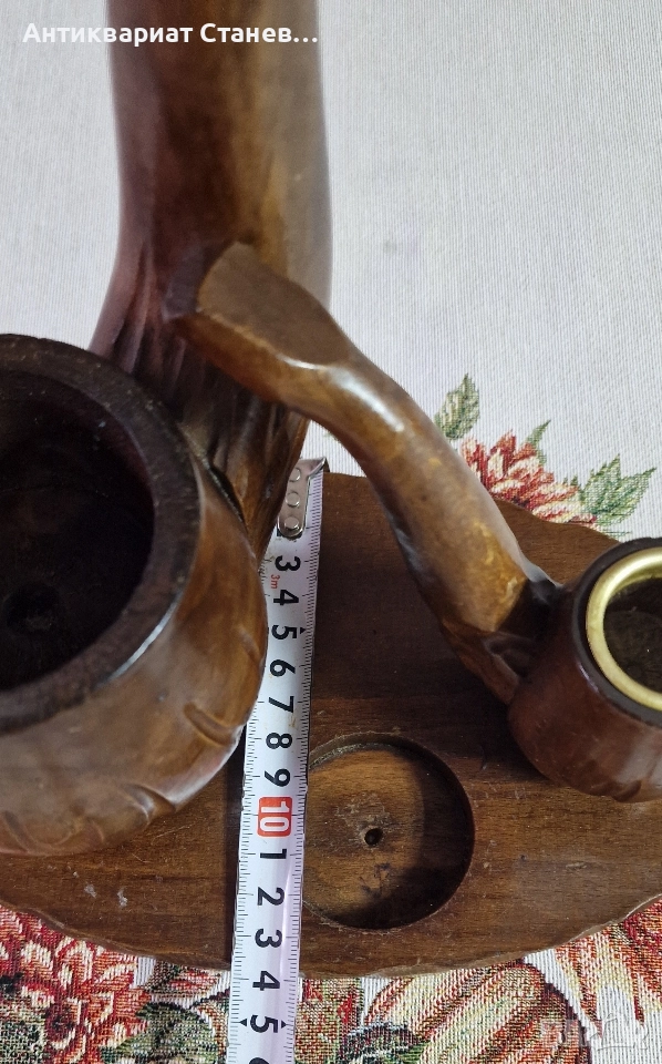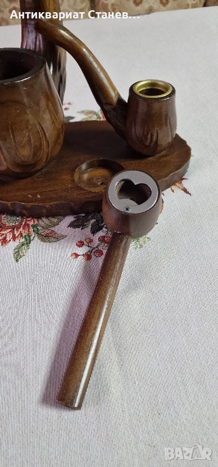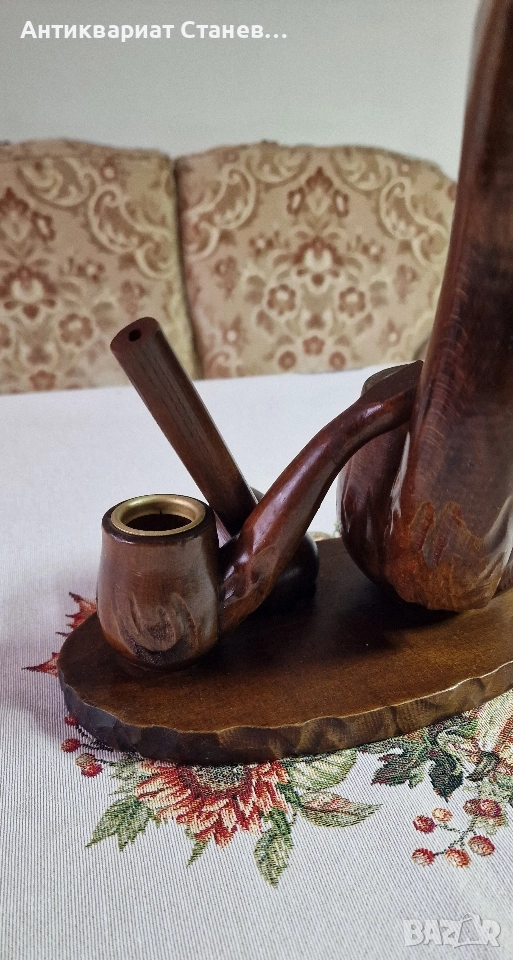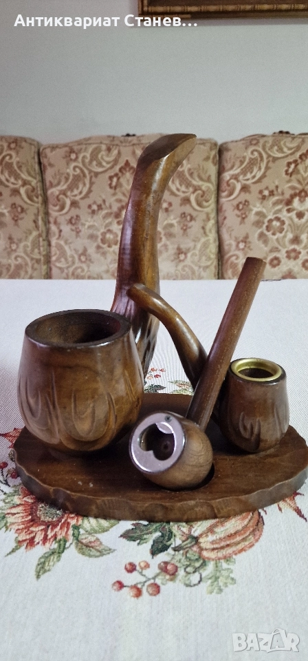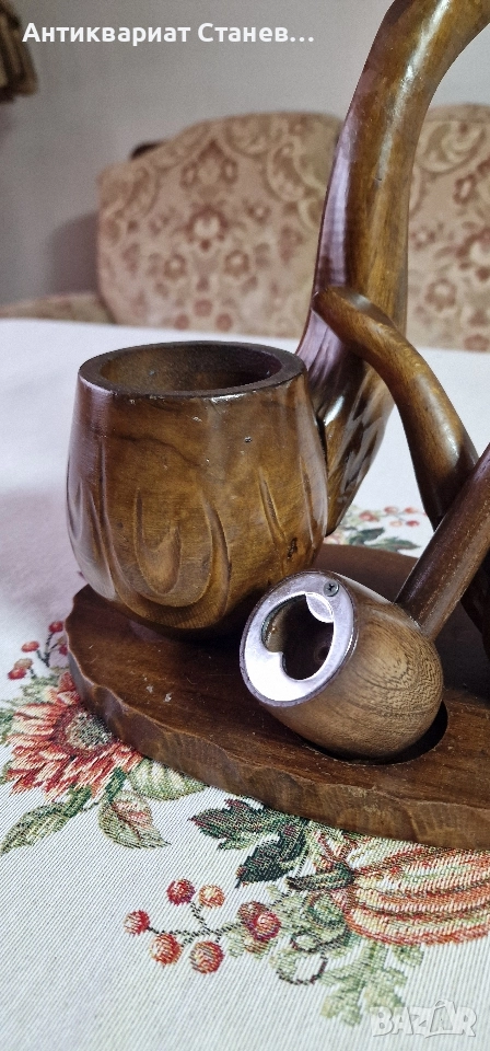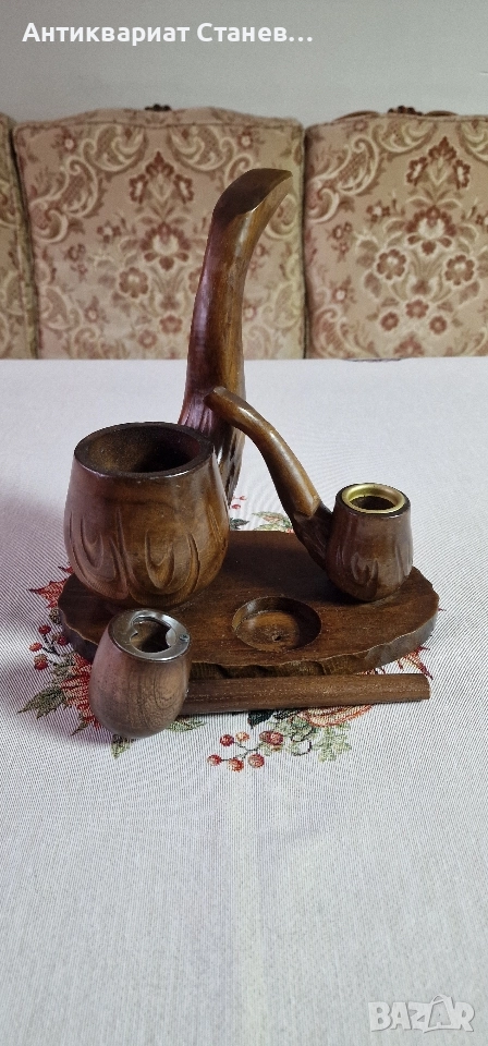 🪵 Красив дървен комплект, изработен в класически винтидж стил. Състои се от една голяма л×ула, оформена като елегантна дръжка, и две малки декоративни л×ули, разположени върху дървена основа.