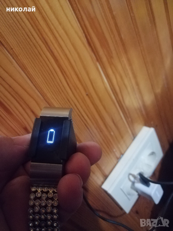 Гривната работи и зарежда добре, батерията не държи много, има кабел за зареждане и не знам с какво приложение работи.