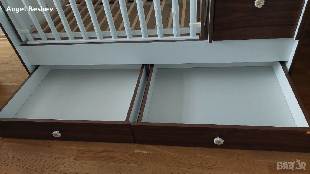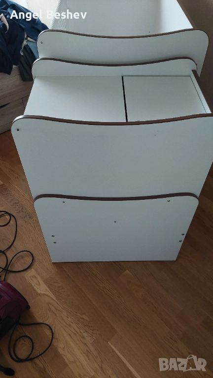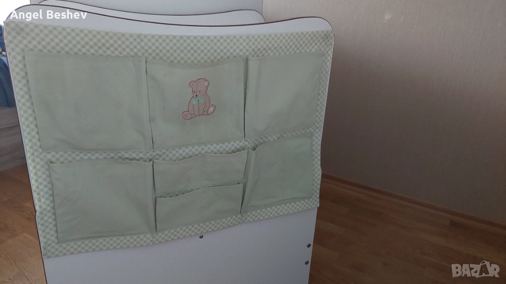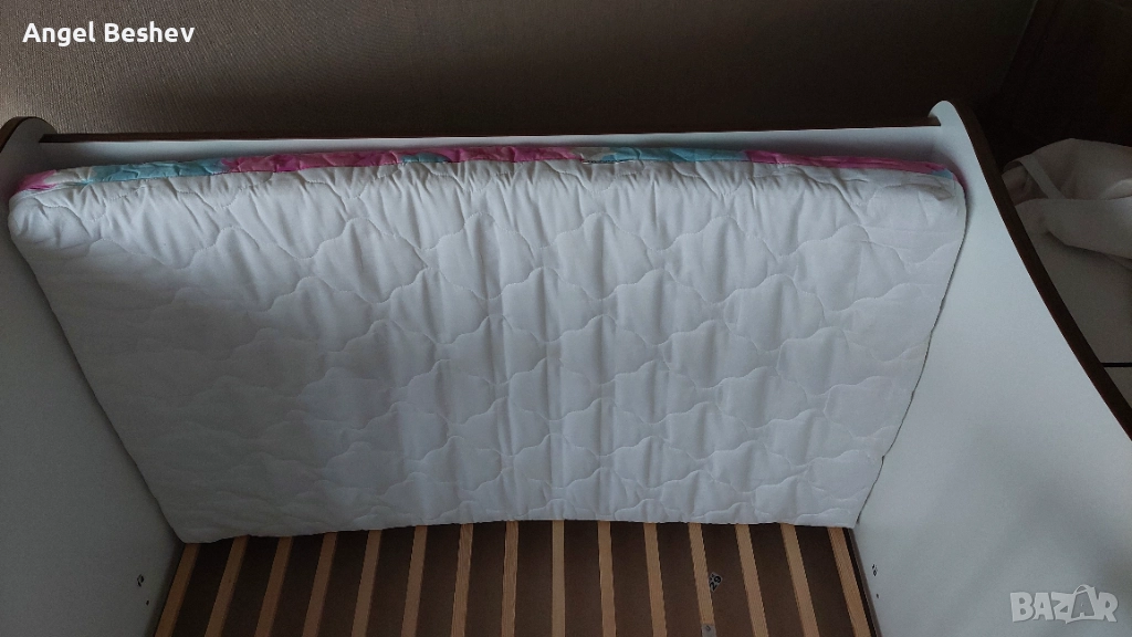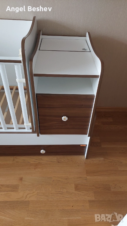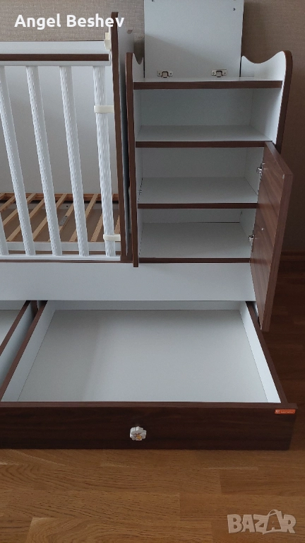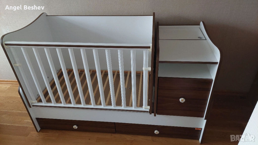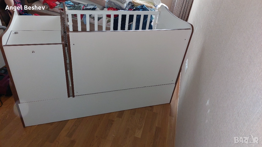 Трансформираща се бебешка кошара в легло, бюро и шкаф - отлично състояние (видно от снимките). Единствената забележка е, че едната гредичка на подматрачната рамка се беше счупила и се наложи да я шинирам с две метални планки. След това рамката издържа на множество детски скокове (-: В цената са включени матрак за кошарата + калъф за матрака + органайзер за монтиране на лявата или дясната страница (виден на последната снимка).
