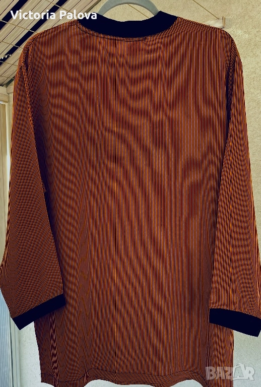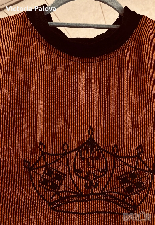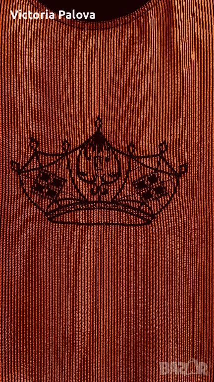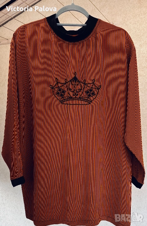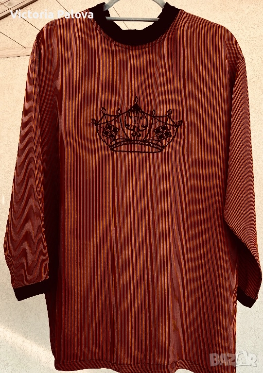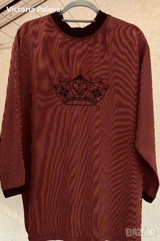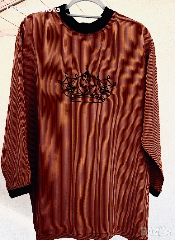 Перфектна блуза за всеки, който обича необичайни, стилни и качествени дрехи с характер. Дамска блуза с удължен свободен силует в наситен кехлибарено- кафяв цвят с фини вертикални черни райета. Красива бродерия на черна кралска корона отпред - дискретен, но впечатляващ детайл. Черни ластици на деколтето и маншетите на ръкавите придават завършен и леко спортно- елегантен вид. Дължина тип туника, 77см, ширина на рамене- 50см, ГО - 56см, ръкав - 53см.