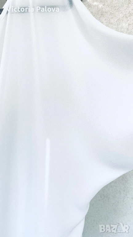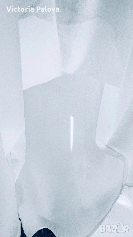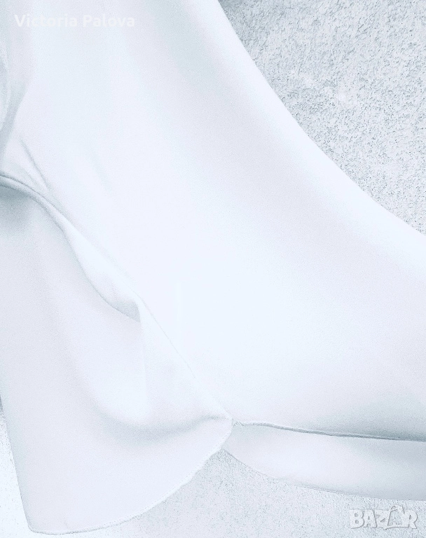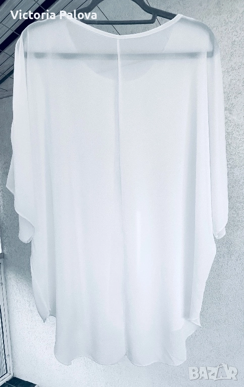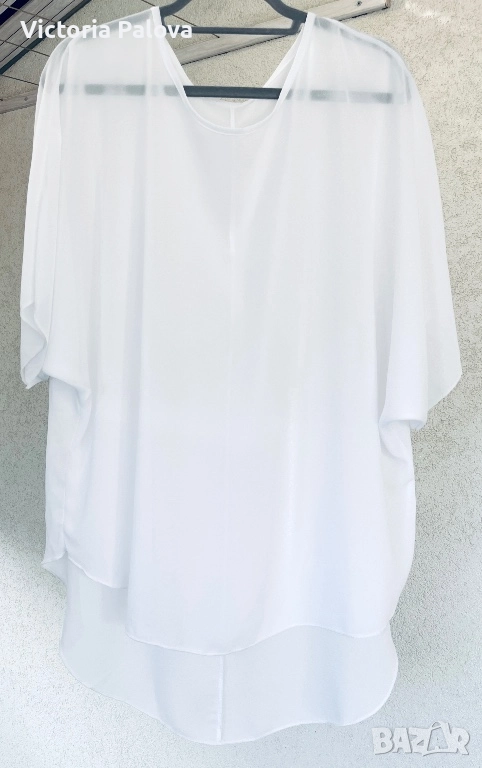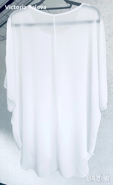 Чисто бяла блуза- туника с модерна кройка, подчертаваща удобство и стила : без шевове по раменете за гладък и чист силует, падащи ръкави, които добавят лекота на движението, класическо кръгло деколте за елегантен акцент, асиметричен подгъв - отпред 73см, отзад - 89см - практичен и интересен дизайн. Лека хладна материя с фин блясък, не се мачка и се поддържа лесно, гръдна обиколка едностранно - 74см. Подходяща е от М до XXL , в зависимост от предпочитаната oversize визия.