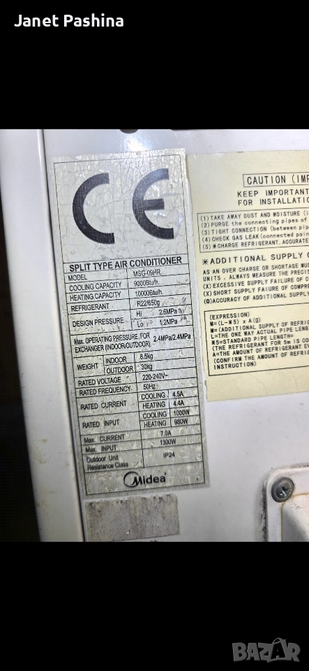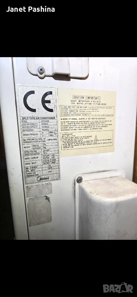 Продавам Сплит Климатик Midea MSG-09HR - 9000/10000 BTU ​Описание на продукта: ​Продавам надежден сплит климатик Midea, модел MSG-09HR. Подходящ е за охлаждане и отопление на помещения с нормален размер. ​Климатикът работи с фреон R22 (моля, обърнете внимание на типа фреон, ако търсите конкретен). ​Технически Характеристики (по табелка): ​Модел: MSG-09HR ​Тип: Сплит Климатик (Split Type Air Conditioner) ​Капацитет на Охлаждане: 9000 Btu/h ​Капацитет на Отопление: 10000 Btu/h ​Хладилен Агент (Фреон): R22 ​Номинално Напрежение: 220-240V ~ ​Номинална Честота: 50Hz