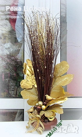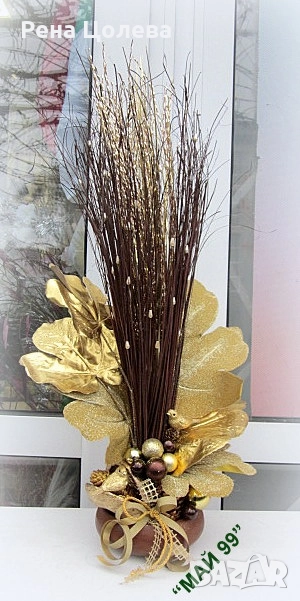 Коледна аранжировка на дървена кръгла ф 13 см.тарелка- сноп натурални пръчки с перли,златни листа аралия,кокос,коледни топки в злато и и 2 малки врабчета с красива панделка с височина 60 см.