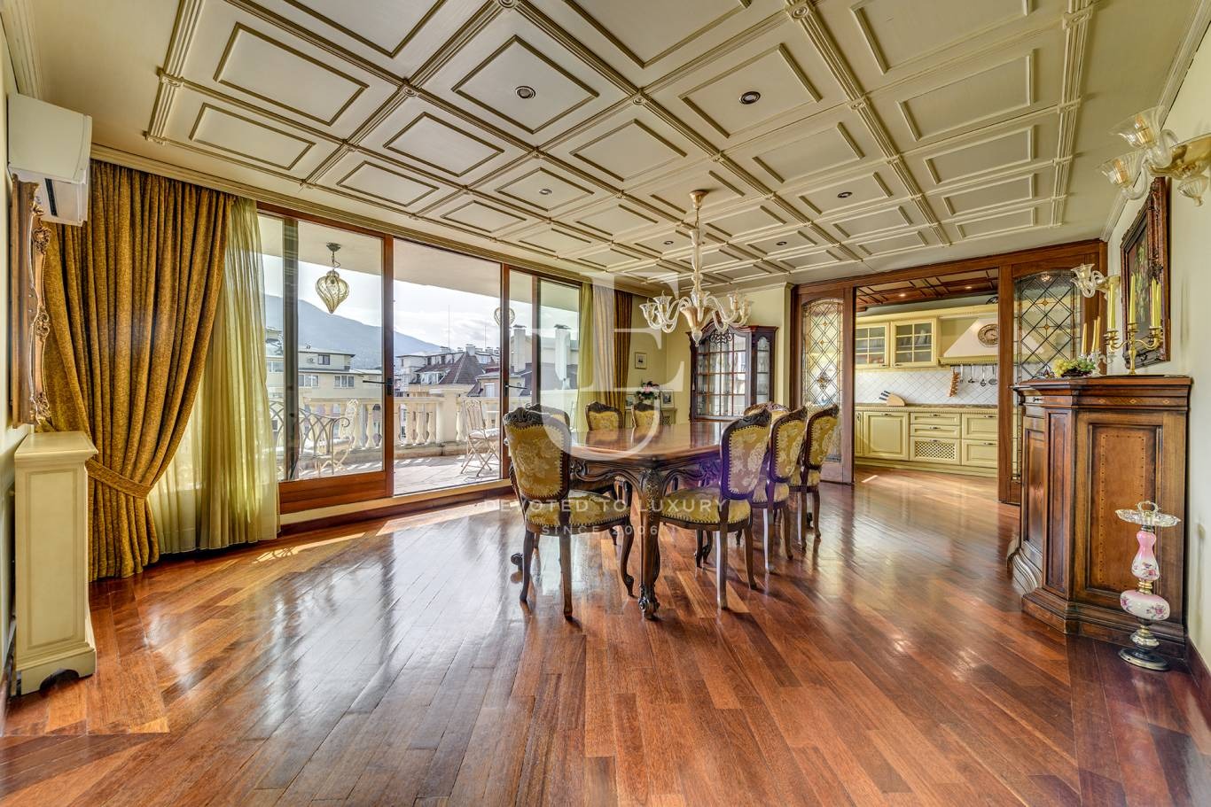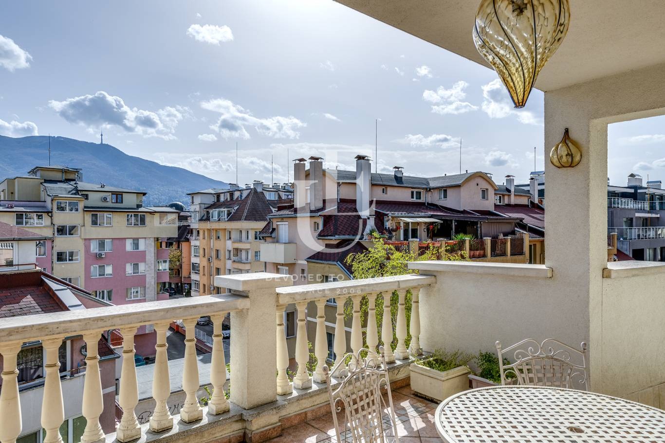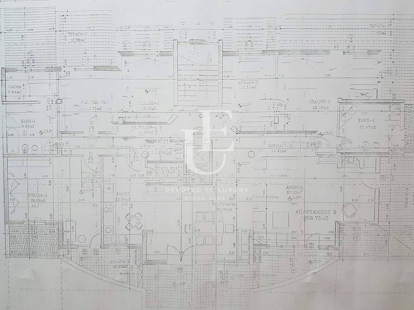 Просторна панорамна дневна с връзка към трапезария, самостоятелна напълно обзаведена кухня с преходни портални врати към трапезарията и голямо складово и техническо помещение към нея. Дневните помещения са изцяло с южно изложение и са разделени от спалнитес коридори. Основната спалня е с тераса, красива камина, луксозна просторна баня и самостоятелна гардеробна с вход директно от спалнята и втори от антрето. Другите две спални са разположени в противоположната част на апартамента и ползват обща баня със санитарен възел и парна баня. Непосредствено до дневната има отделен санитарен възел за гости. По продължението на цялата трапезария е разположена панорамна тераса с южно изложение. Ref. ID:26006