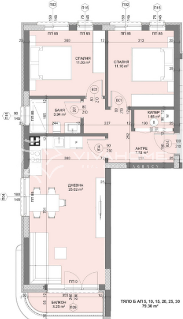 Разпределение: антре, санитарно помещение, дневна с кухненска част, спалня, балкон