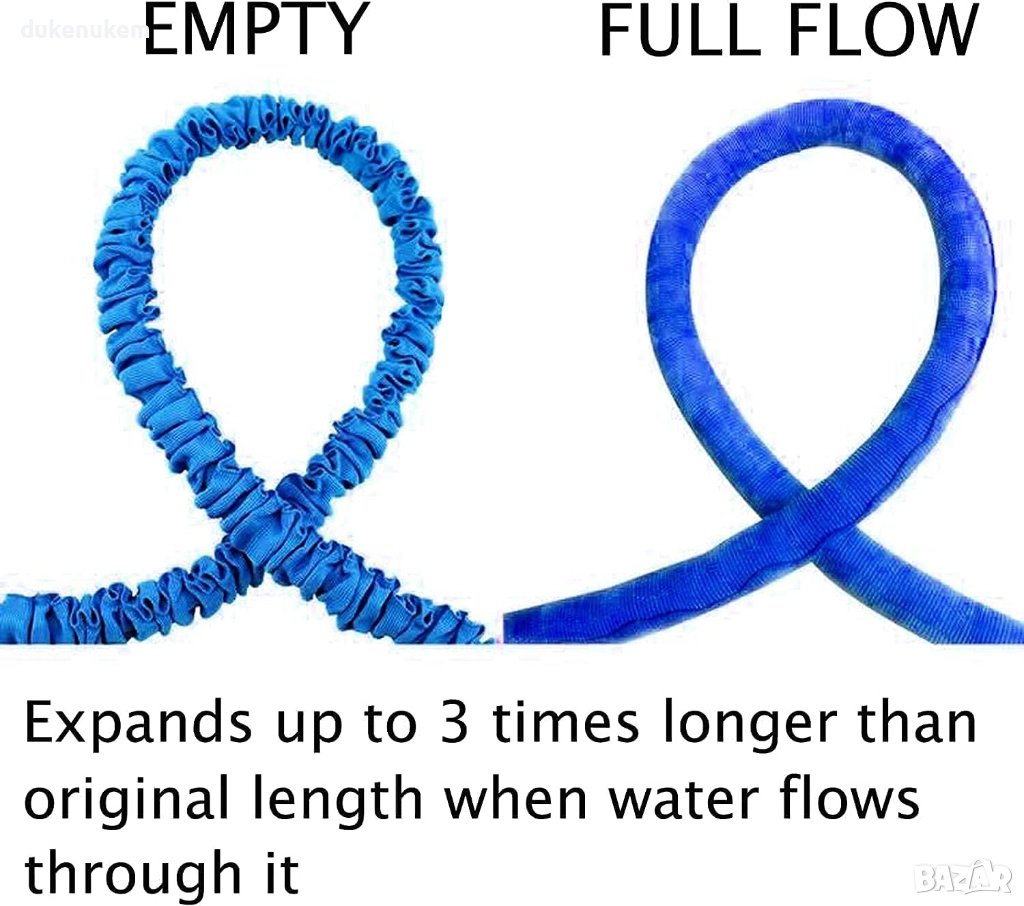 Разтегаем до 3 пъти дължината си – до 15 м (50FT), след източване се прибира до първоначалния си размер.