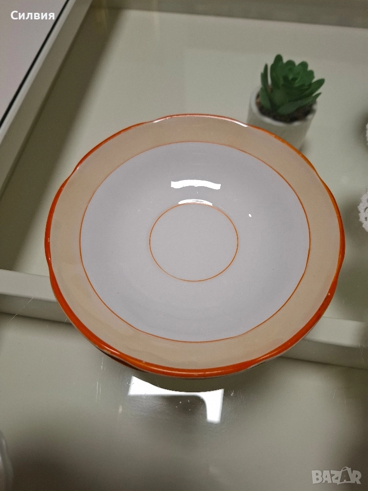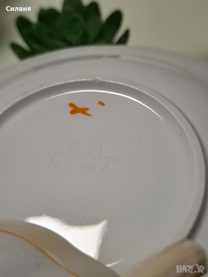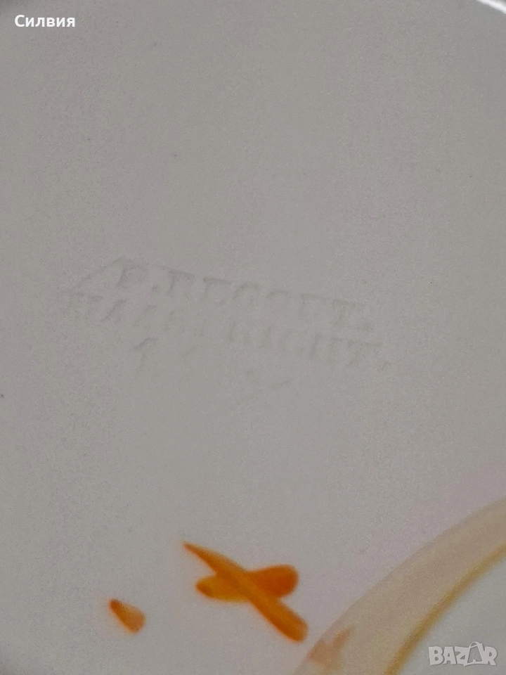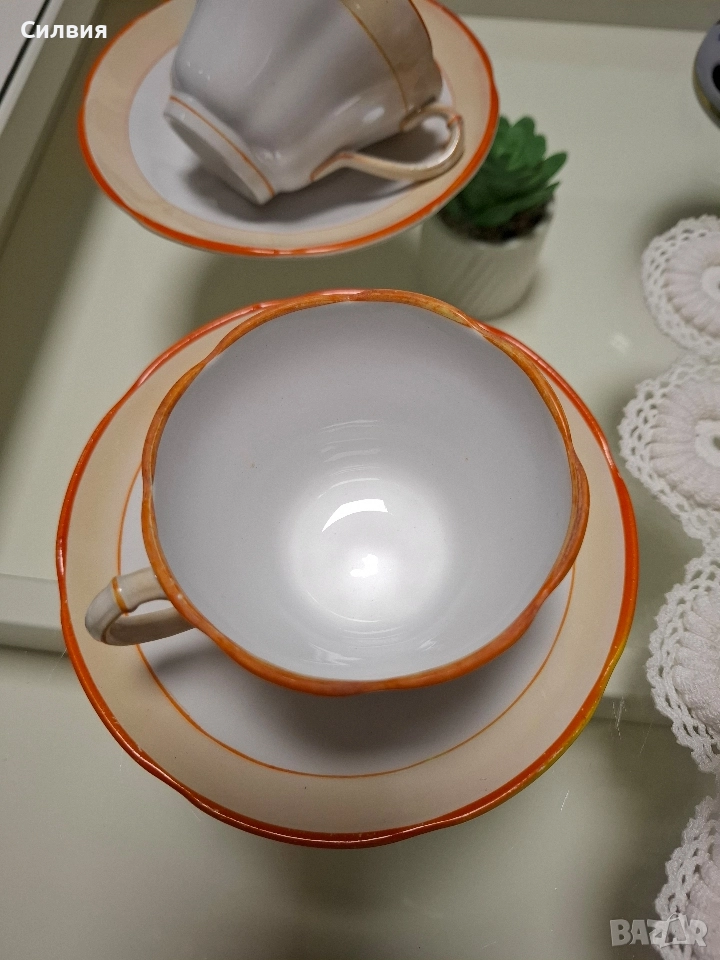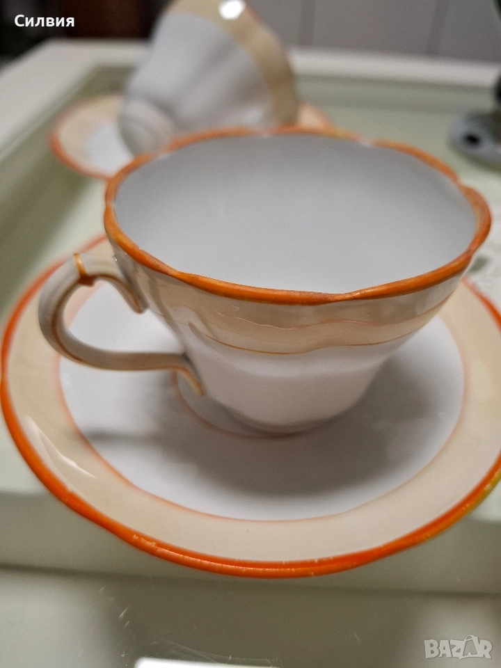 ☕ Антикварни Порцеланови Чаши с Чинийки PETRUS REGOUT MAASTRICHT, Холандия – Модел „Граната“ 🍊 Продавам изключителен комплект от антични чаши за кафе/чай с чинийки от известната холандска фабрика PETRUS REGOUT MAASTRICHT. ✨ Основни характеристики: Производител: Petrus Regout & Co., Маастрихт, Холандия. Период: Около 1855–1875 г. (датум, основан на маркировката). Модел: „Граната“ (Granata) – елегантен дизайн с ръчно рисувани оранжеви/теракотени кантове. Състояние: Отлично за годините си, с леки следи от времето, които подчертават автентичността им. (Моля, вижте прикачените снимки.) 📐 Размери: Вместимост на чашата: 150 мл. Диаметър на чинийката: 14 см. 📜 История: Комплектът е прекрасен пример за висококачествения порцелан, произвеждан от Petrus Regout през втората половина на XIX век. Маркировката P.REGOUT.MAASTRICHT е ясно видима на дъното на чинийката (вижте снимката). Идеален за колекционери на европейски порцелан и любители на винтидж интериора. Цена: