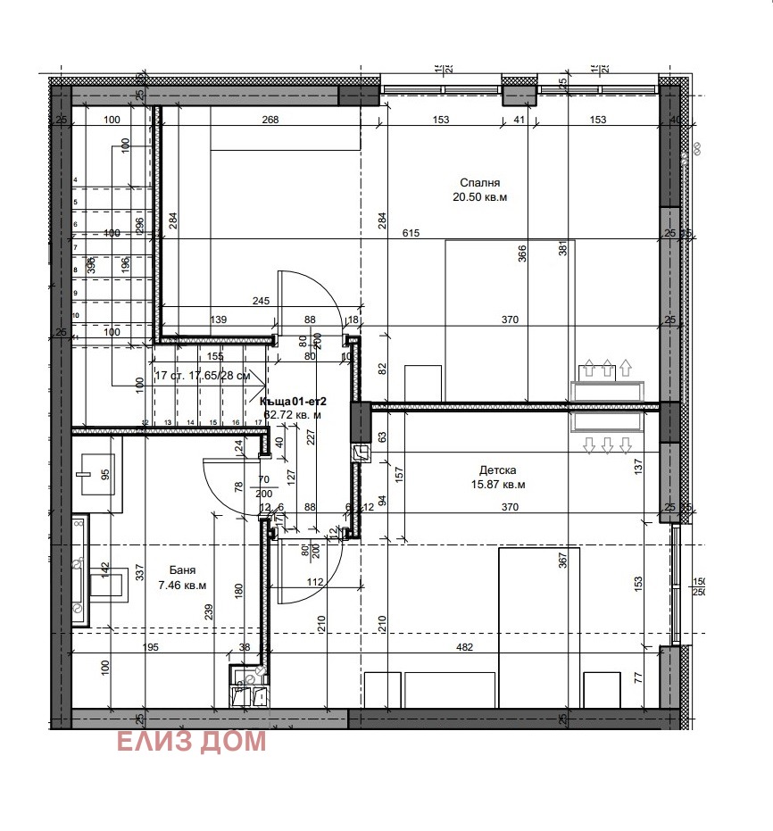 Ет.2: две спални (20.50кв.м и 15.87кв.м), баня (7.46кв.м), коридор.