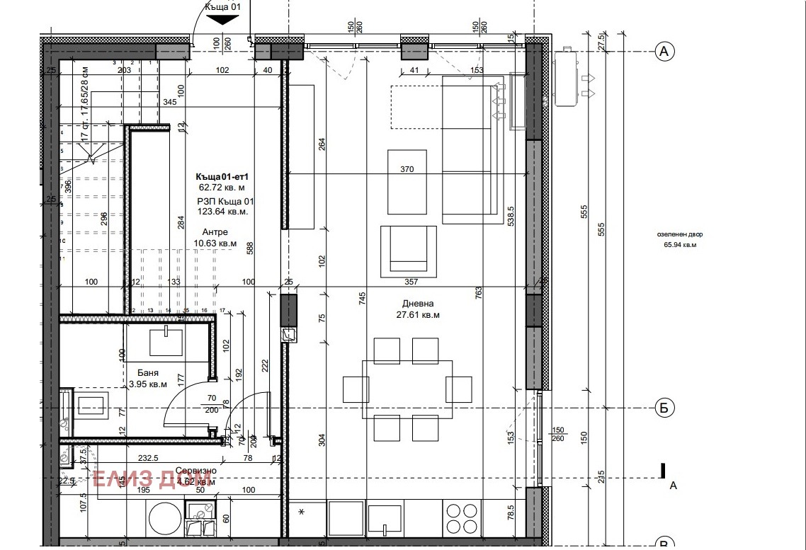 Ет.1: дневен тракт (27.61 кв.м) с излаз към озеленен двор, баня (3.95кв.м), сервизно помещение (4.62 кв.м.) , антре (10.63кв.м) и стълбище към втори етаж;