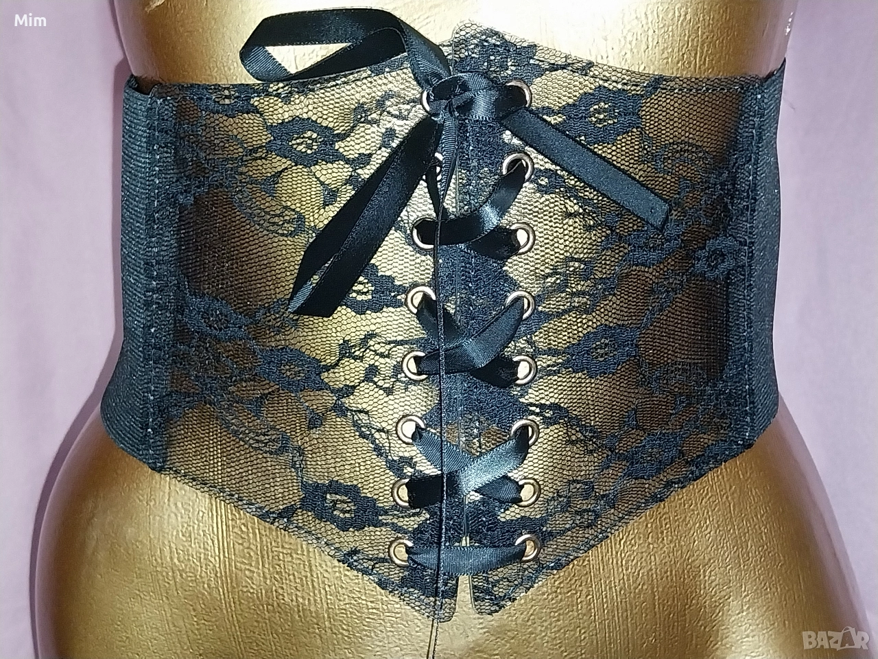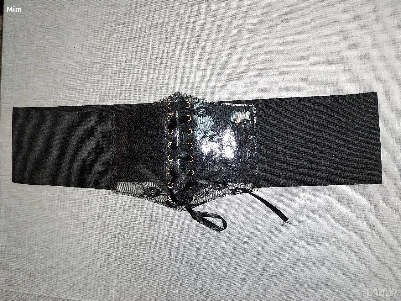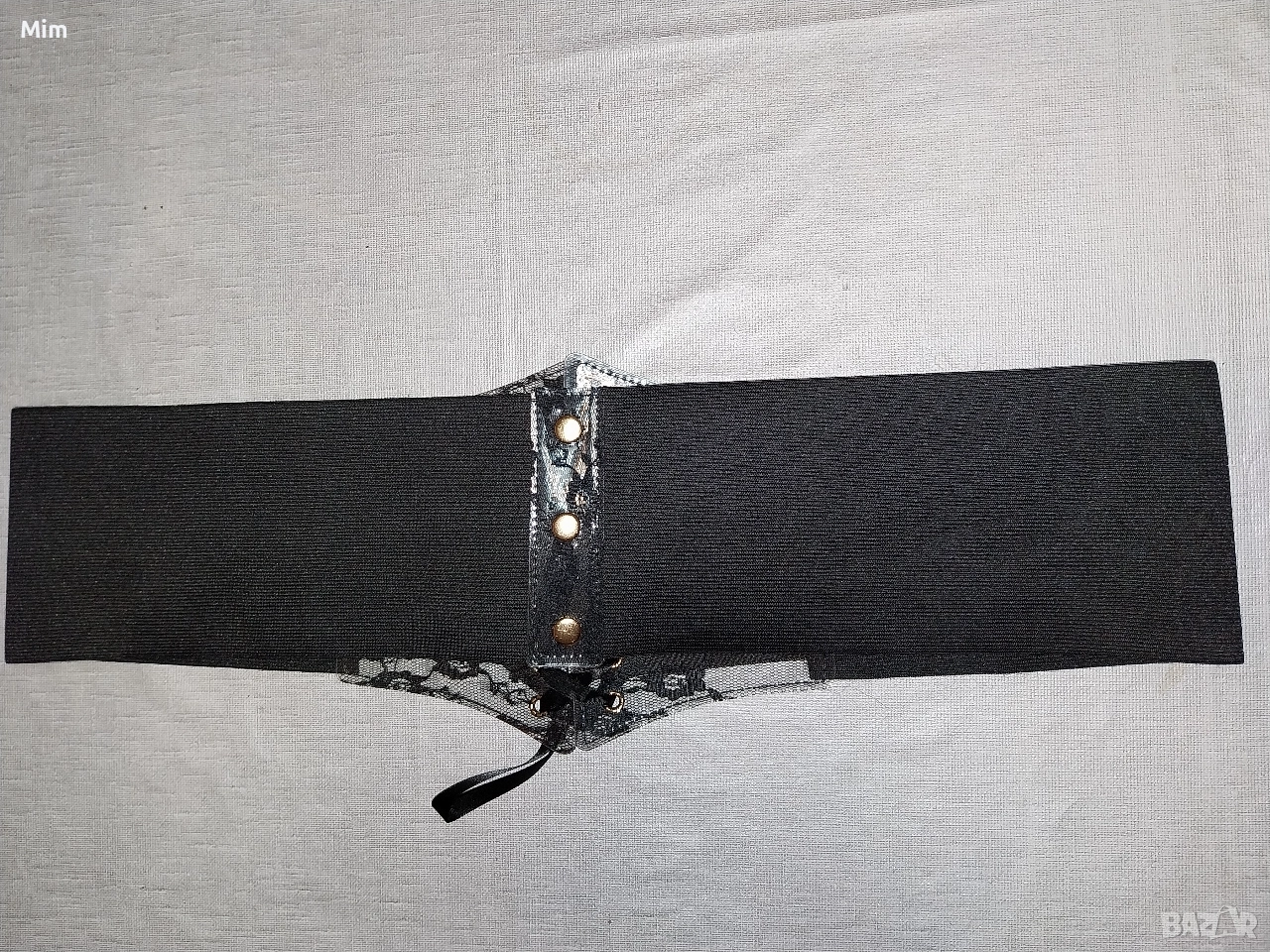 Черен колан с широк ластик закопчаването е отзад с копчета тик так, отпред с капси с шнур за регулиране на размера дантелата и от твърда пластмаса за да стой изправен и да прибира корема Нов .Талия от 110 см до 170 еластичност дължина от17 до 12 см в ластика .