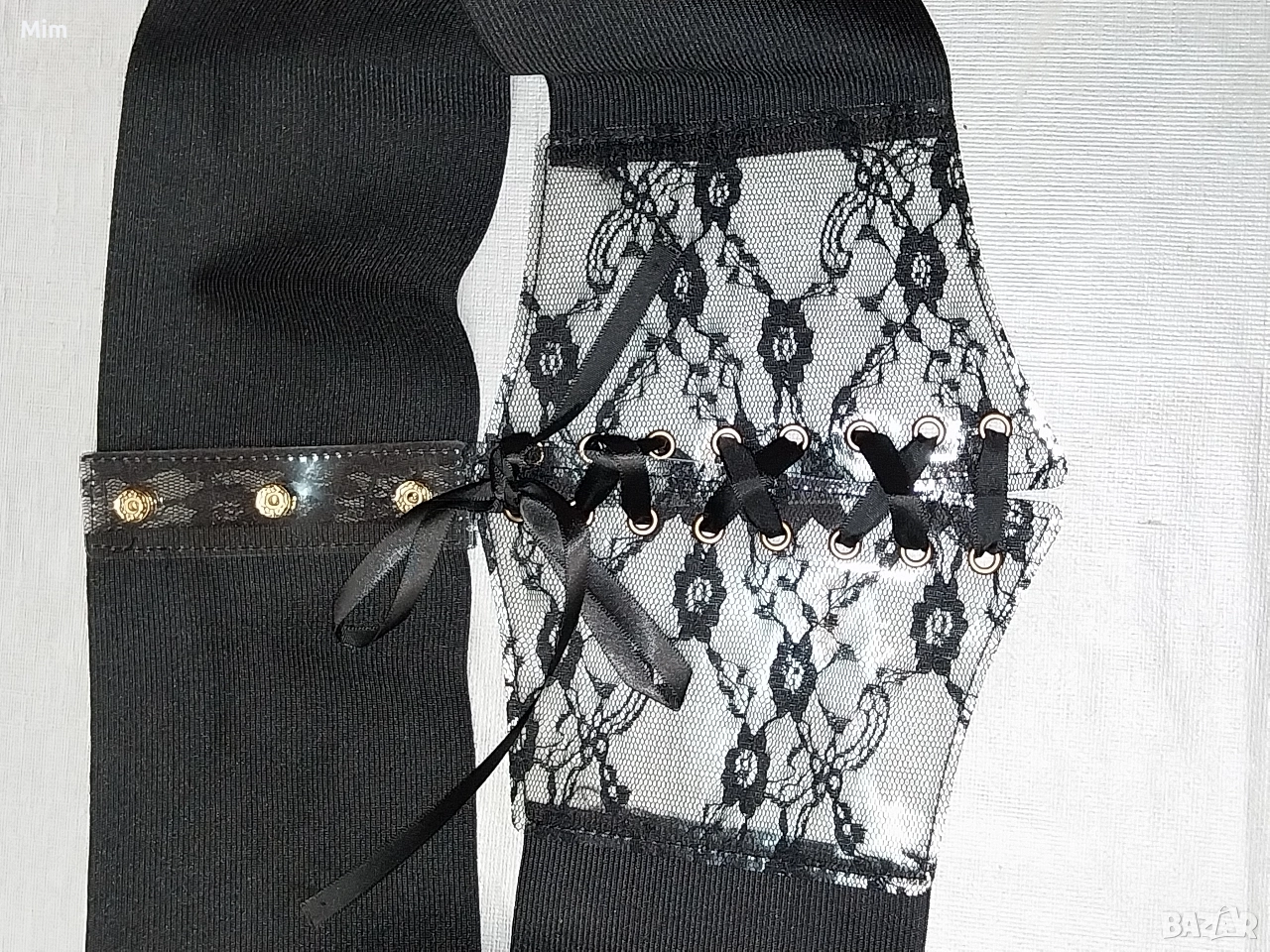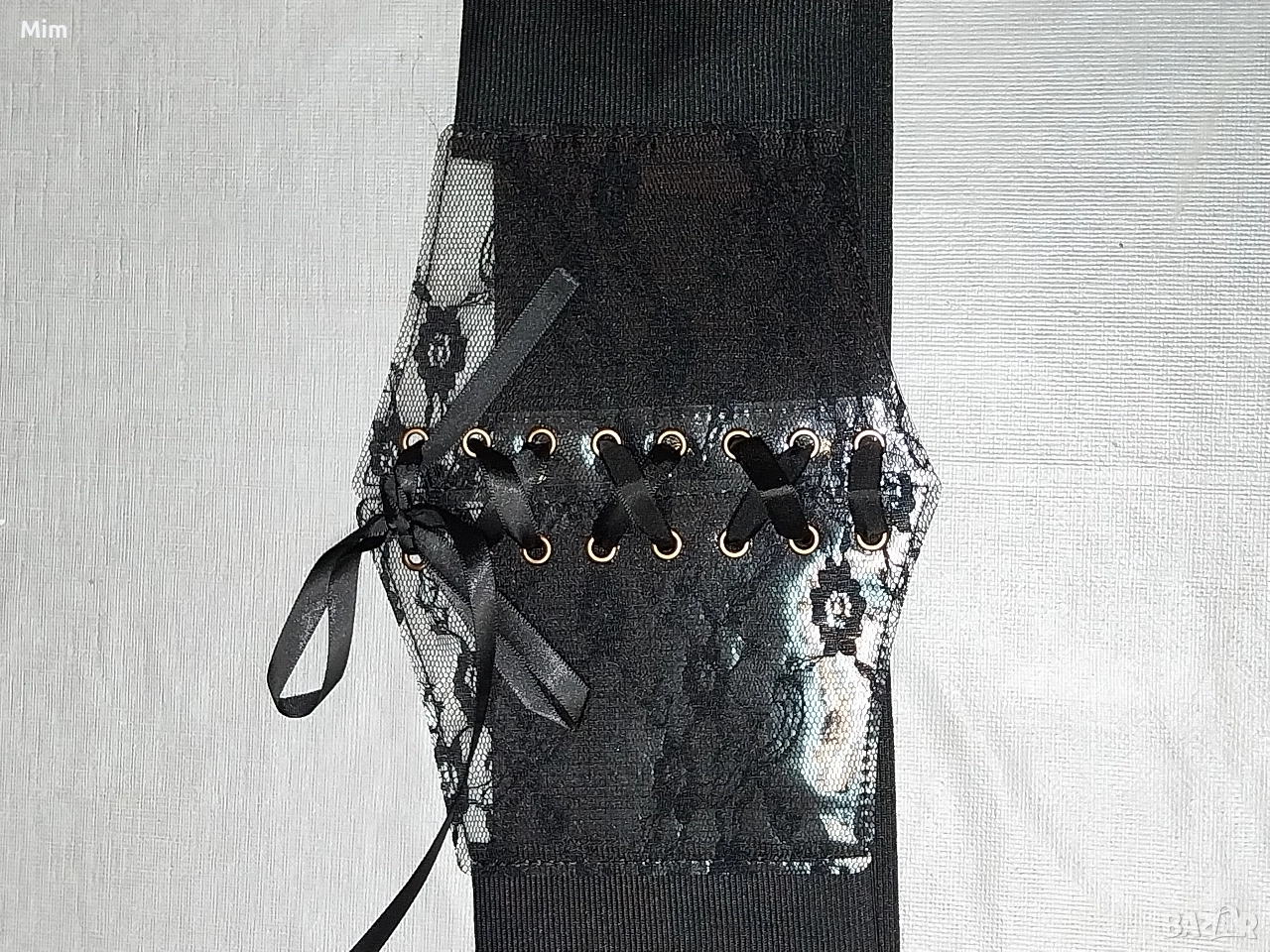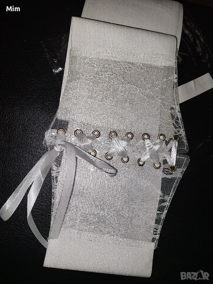 Черен колан с широк ластик закопчаването е отзад с копчета тик так, отпред с капси с шнур за регулиране на размера дантелата и от твърда пластмаса за да стой изправен и да прибира корема Нов .Талия от 110 см до 170 еластичност дължина от17 до 12 см в ластика .