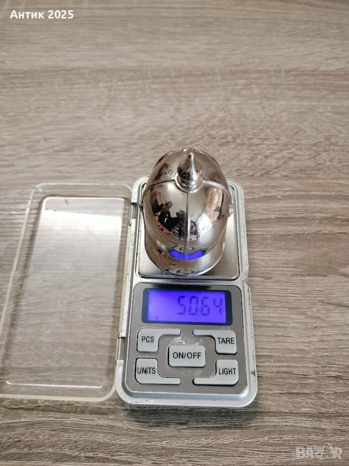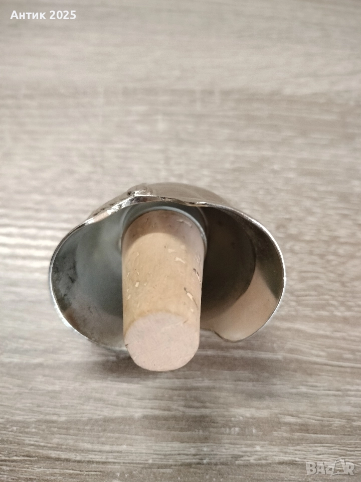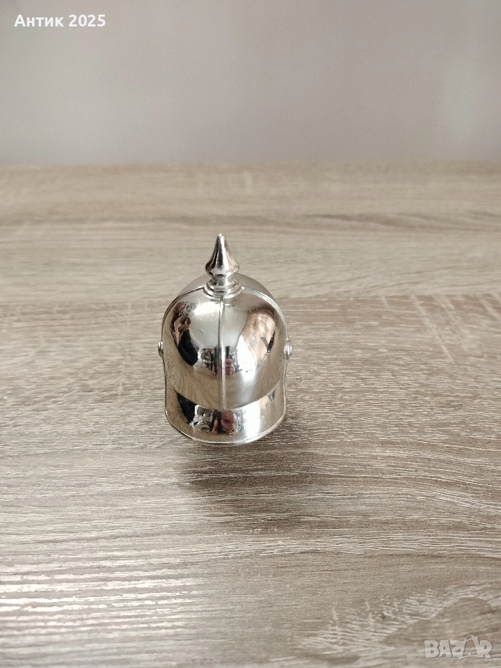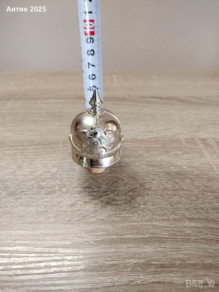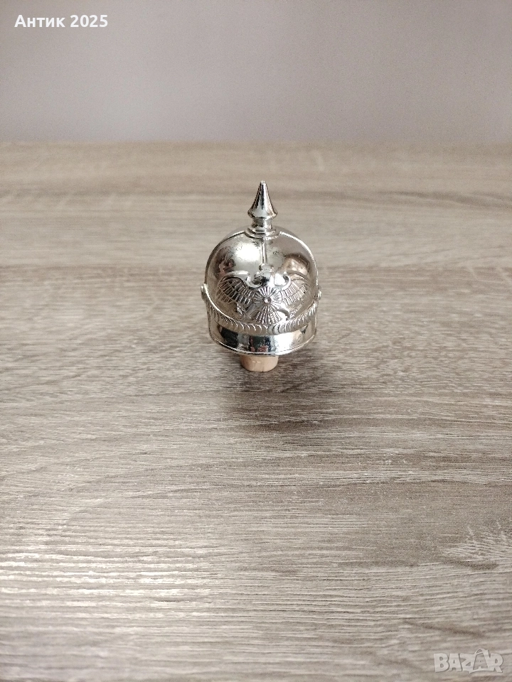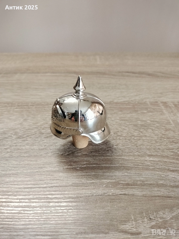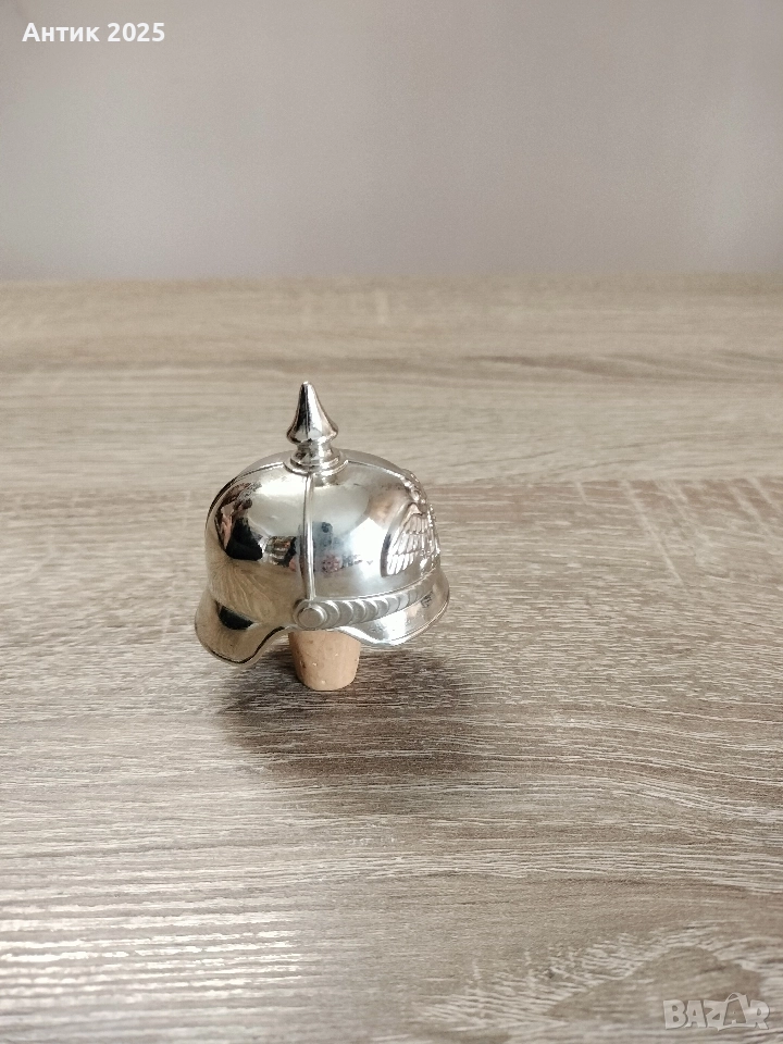Винтидж декоративна тапичка за бутилки, изработена във формата на прочутия немски шлем „пикелхаубе“. Пикелхаубата е характерен пруски военен шлем с връх, използван през XIX и началото на XX век. Той е бил не само защитно средство, но и символ на пруската военна традиция. Металната част на тапичката има релефен орел – детайл, който се е срещал и върху оригиналните офицерски шлемове. Горната част е метална с детайлна изработка, а отдолу има естествен корков елемент, който прави изделието напълно функционално. Подходящо е за винени и ликьорни бутилки или като декоративен елемент. Отличен подарък за колекционери, любители на историята или като стилен акцент в домашния бар.