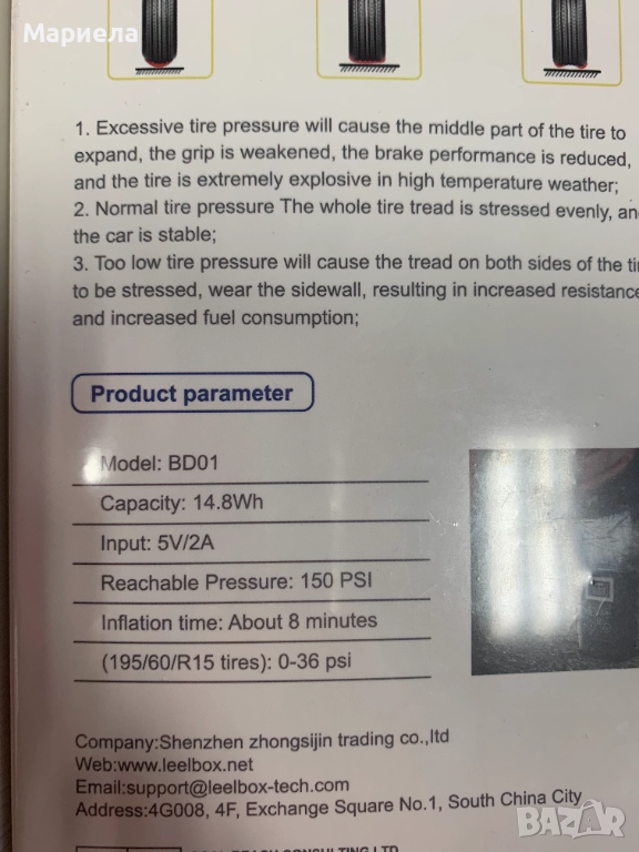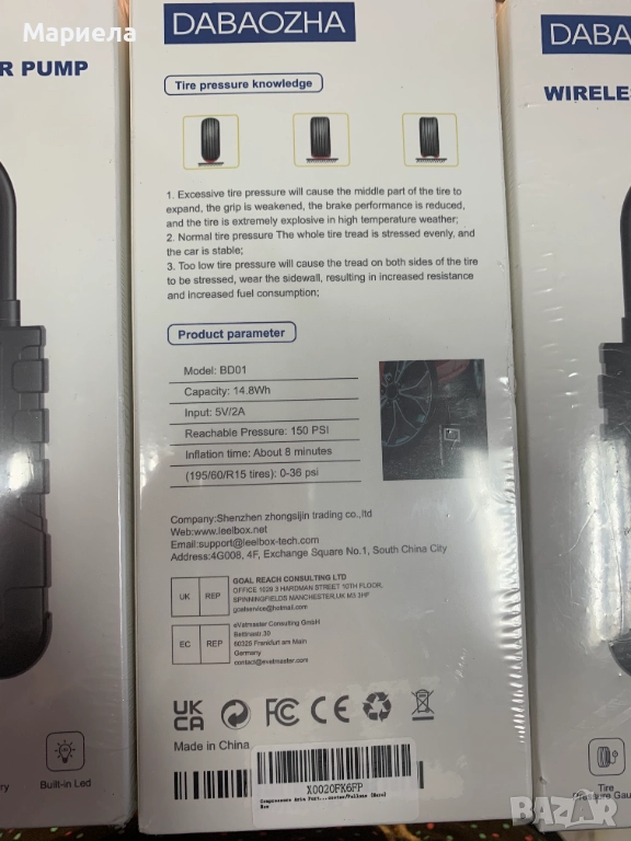 Този безжичен компресор е оборудвана с акумулаторна батерия от 6000 mAh и има LED екран със символ за индикатор за енергия, за да се зарежда навреме, когато е налична само една клетка.