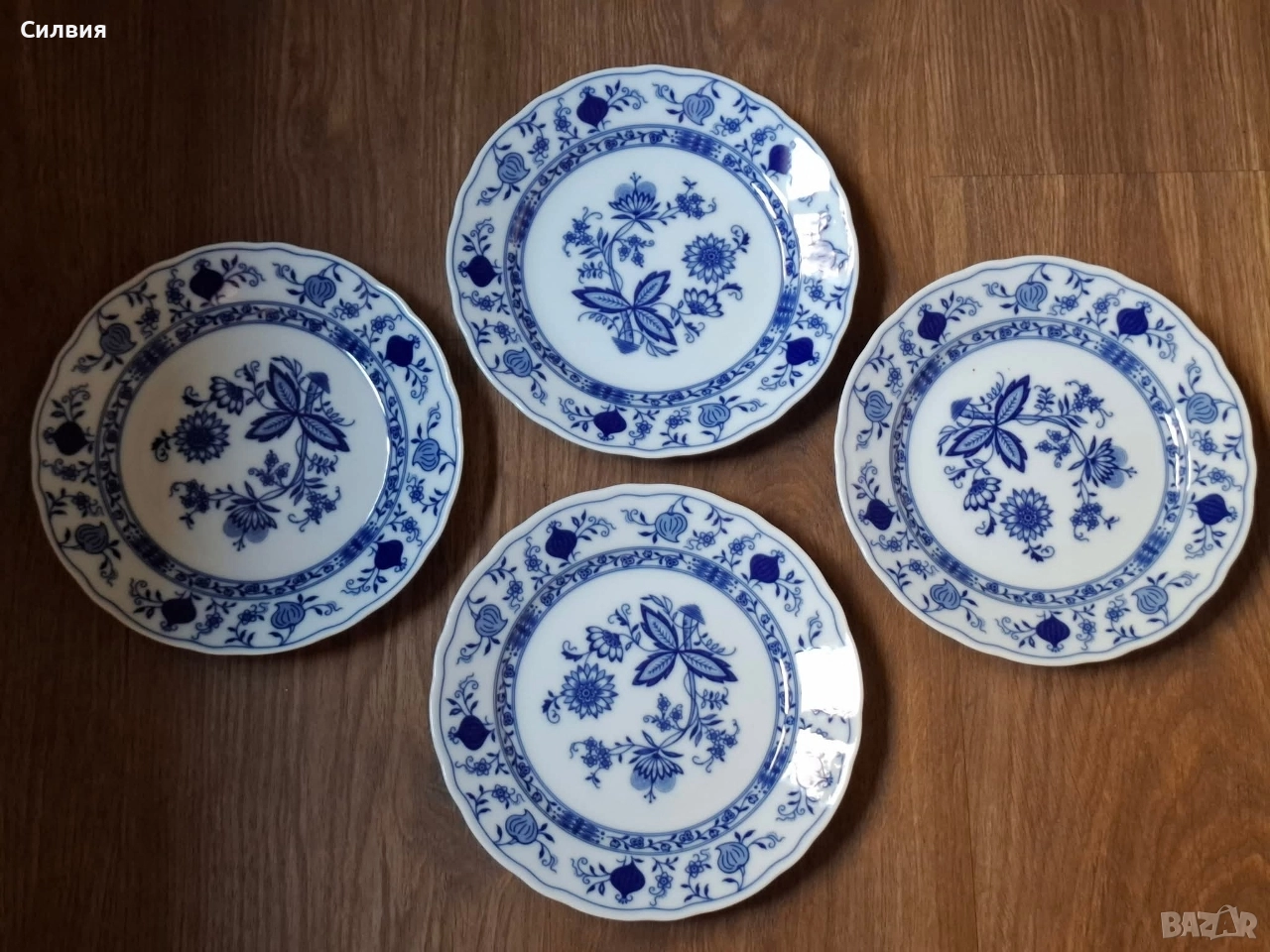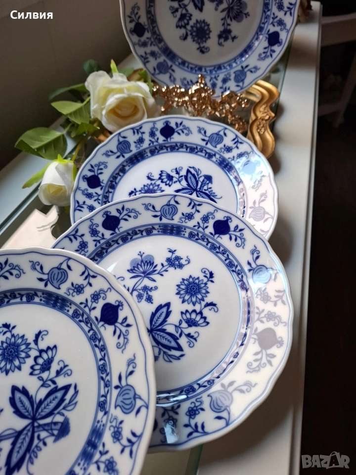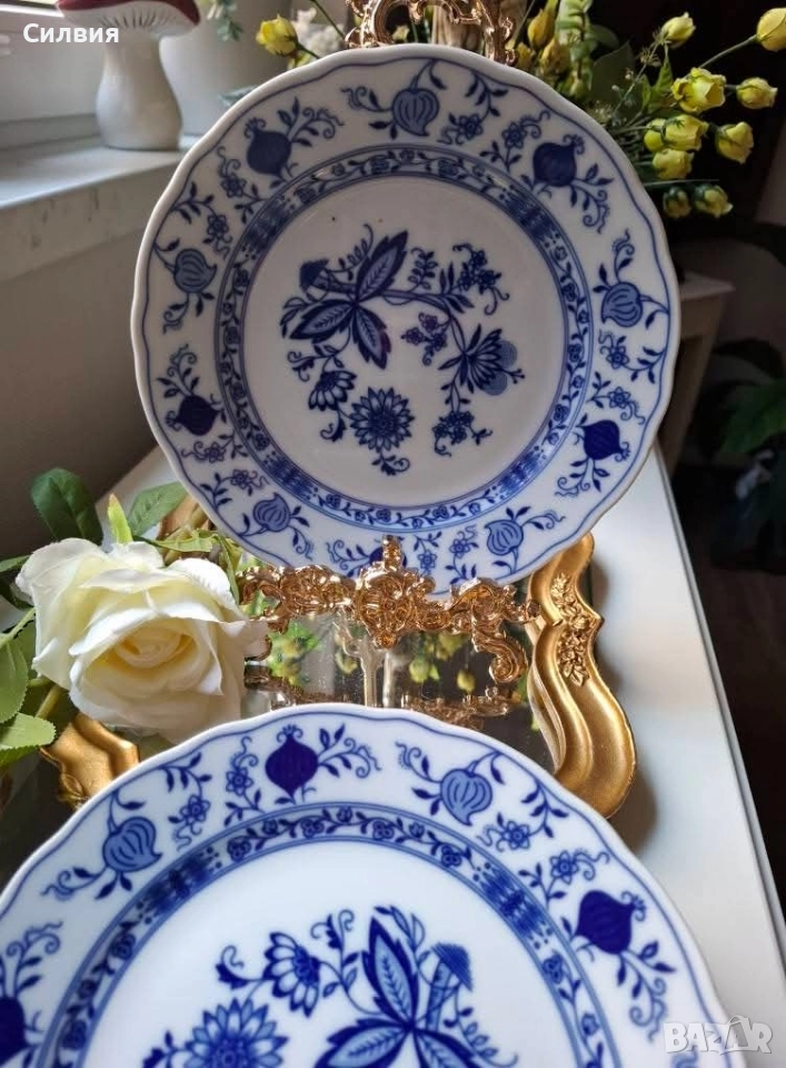 Характерни за тези чинии е емблематичният "Blue Onion" (Син Лук) мотив – класически дизайн, който води началото си от азиатските флорални мотиви и е популяризиран в Европа от