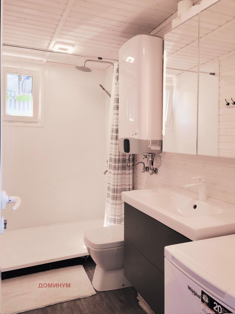 Банята е реновирана, с качествени плочки, душ кабина и прозорец за естествена вентилация. Имотът разполага със собствено паркомясто и поддържана градина, допринасяща за уединение и спокойствие.