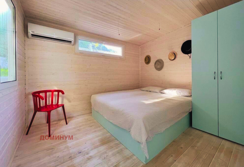 Къщата е със застроена площ около 56 кв.м и е в отлично състояние, готова за използване без нужда от ремонт. Включва светъл хол с кът за хранене за 6 8 души, климатик и директен излаз към просторен дървен декинг от 30 кв.м. който обгръща целия дом и създава естествена връзка с природата. Кухнята е напълно оборудвана с модерни вградени уреди (AEG фурна и котлони, миялна, хладилник, микровълнова). Двете спални са просторни, с големи легла (180 см), естествена светлина и вентилация; едната разполага с климатик.