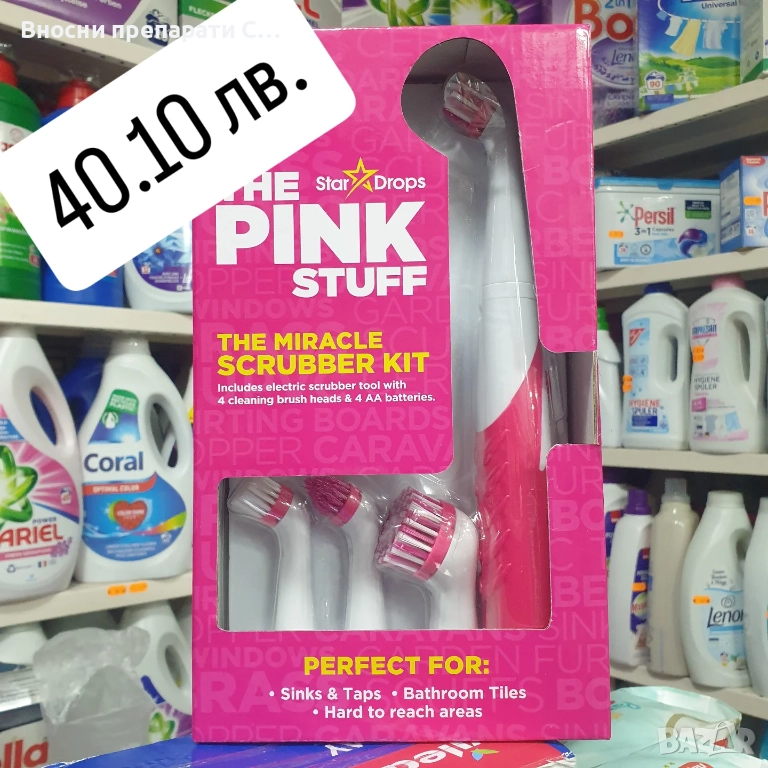 Комплектът за почистване Pink Stuff Miracle -40.10 лв., включва електрически инструмент за почистване с 4 глави за четка за почистване (включени са 4 AA батерии). Този специален комплект за почистване помага за по-лесно справяне с най-трудните задачи за почистване!