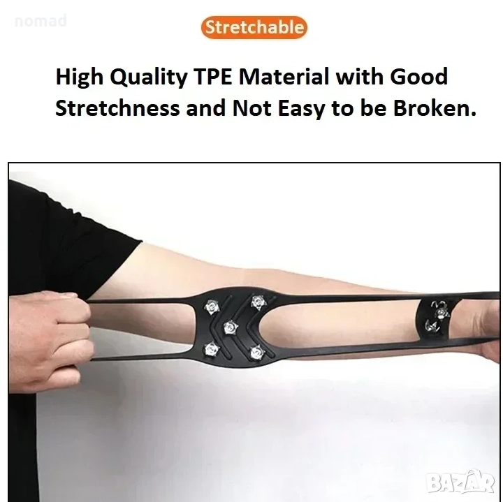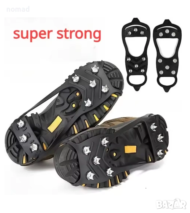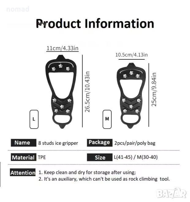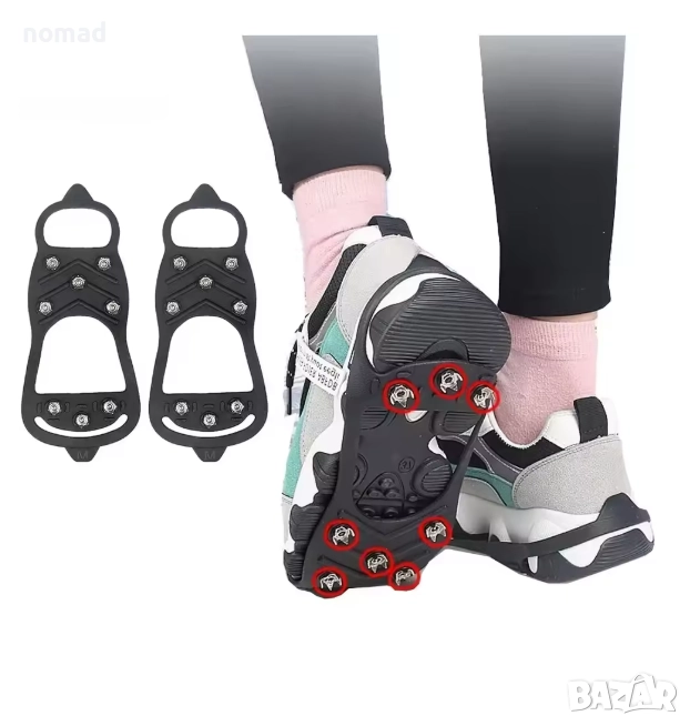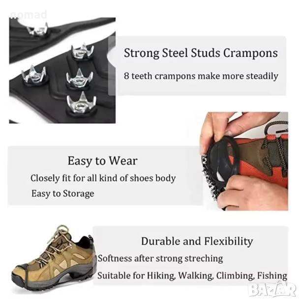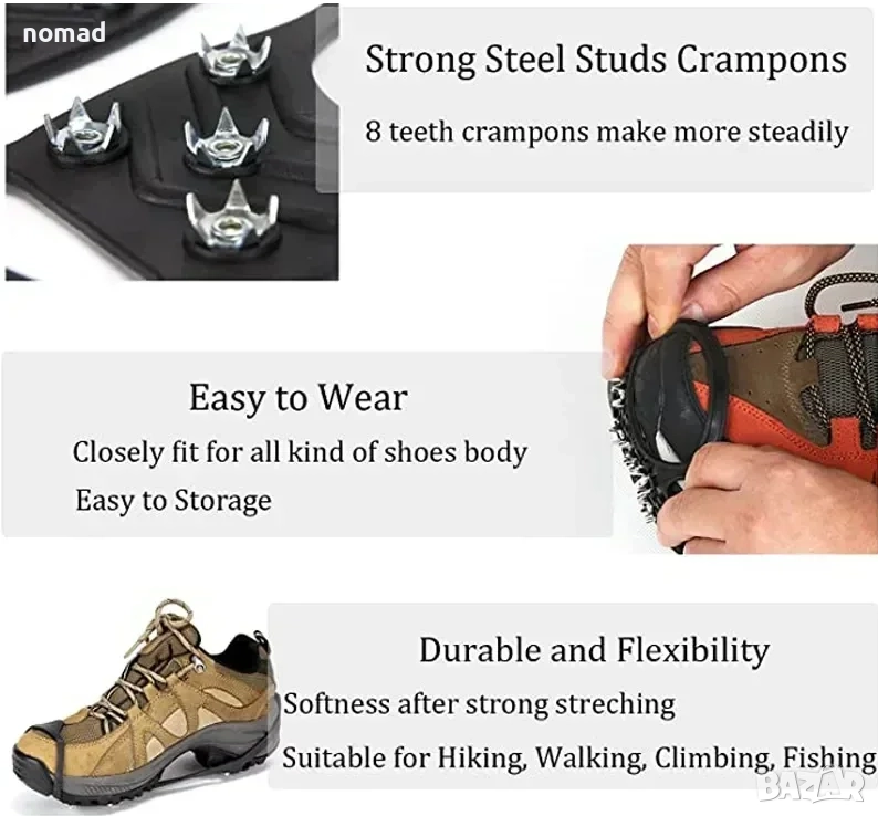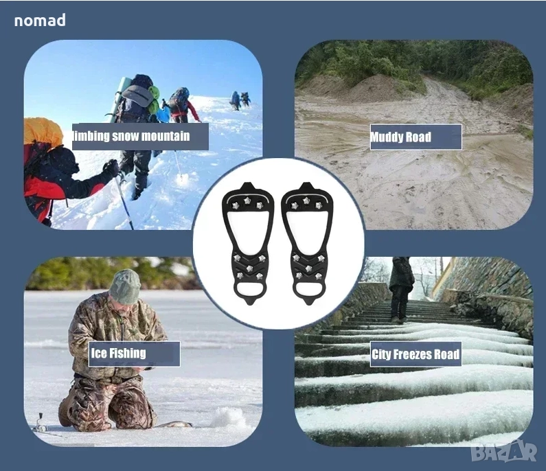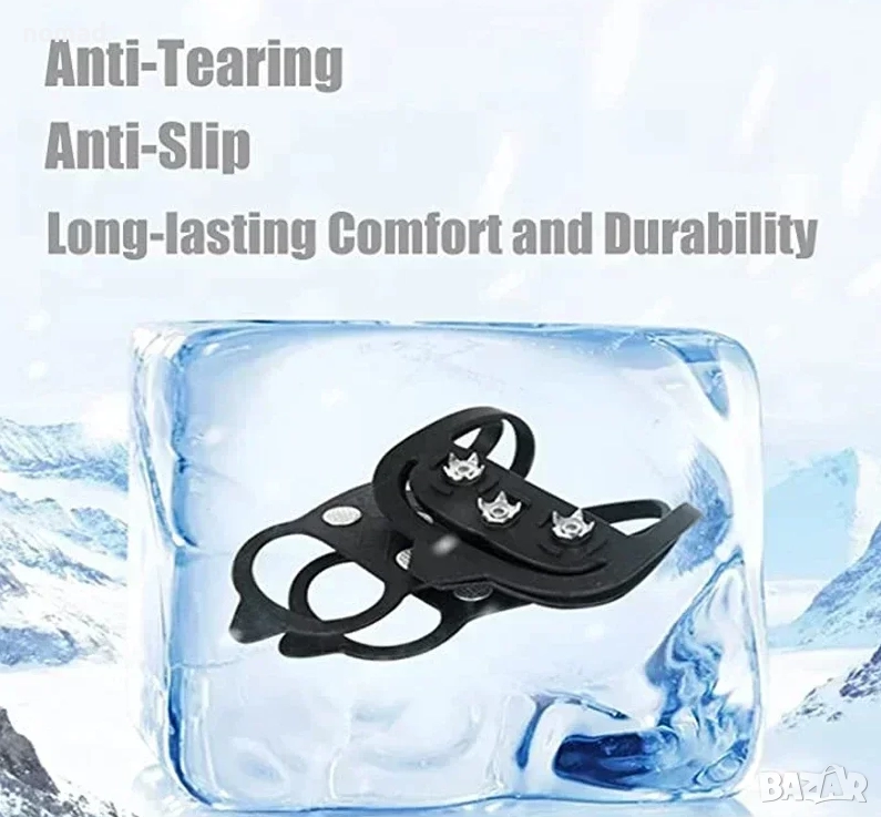 - Дизайн с противоплъзгащи детайли: Дизайнът с 8 шипа може да предложи отлично сцепление върху лед и сняг, за да се избегне подхлъзване или падане в заледени участъци.
