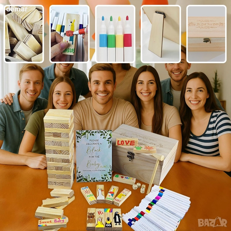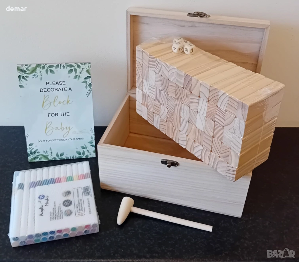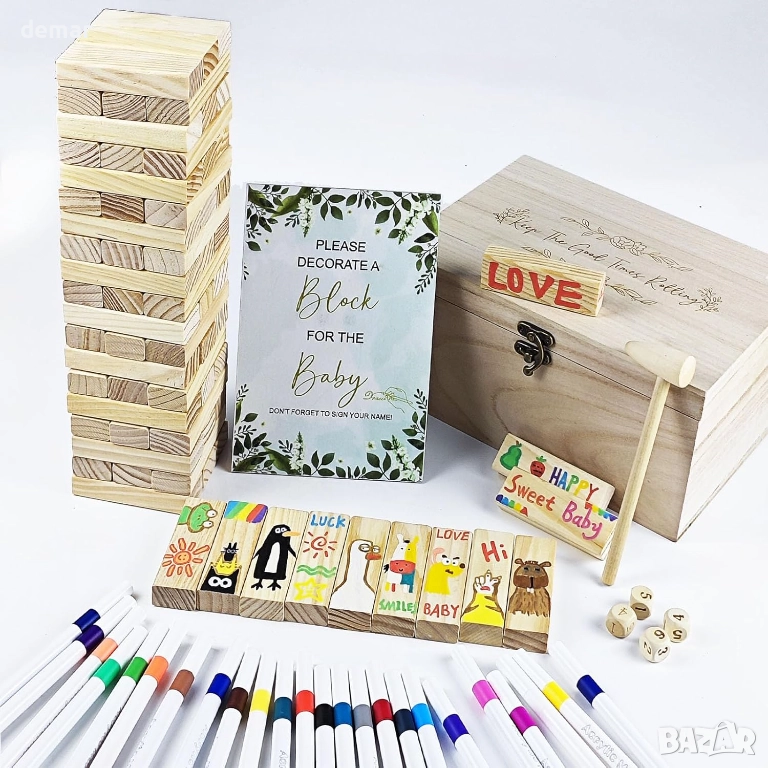 Този комплект съчетава креативно рисуване и игра за парти подреждане, позволявайки на гостите да декорират дървени пръчици с акрилни маркери или да се редуват да премахват парчета с чук, без да разрушат купчината. Комплектът включва 70 полирани дървени ленти, маркери за рисуване, дървена табела, чук, зарчета и кутия за съхранение, всички изработени от гладки, безопасни материали, подходящи за групова игра. Проектиран за бебешки партита, разкриване на пола и първи рождени дни, той добавя интерактивно забавление, насърчава участието на гостите и създава запомнящи се сувенири за случая.