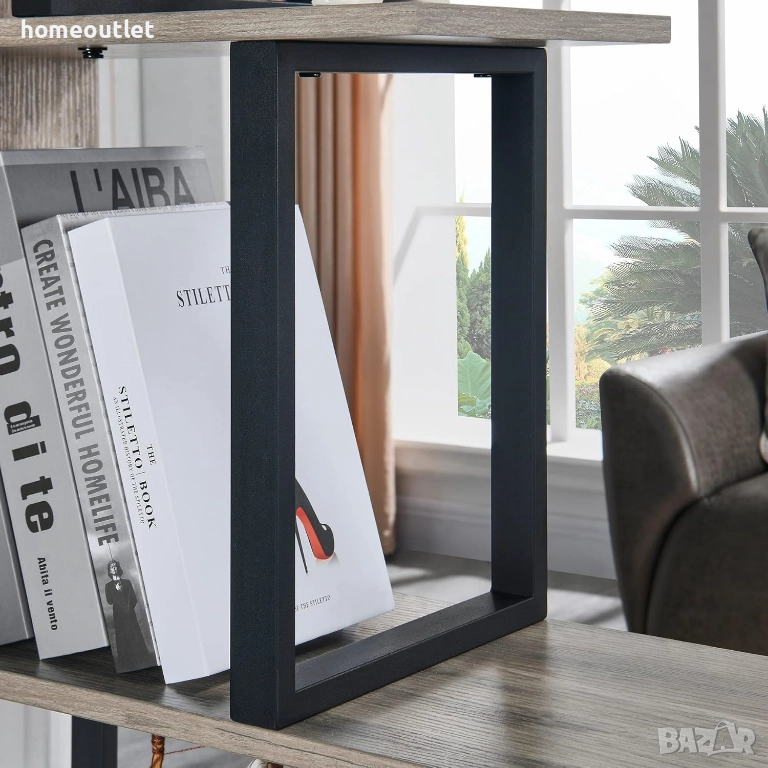 Тази уникална етажерка с L-образна форма се отличава с модерен винтидж дизайн и практичност.